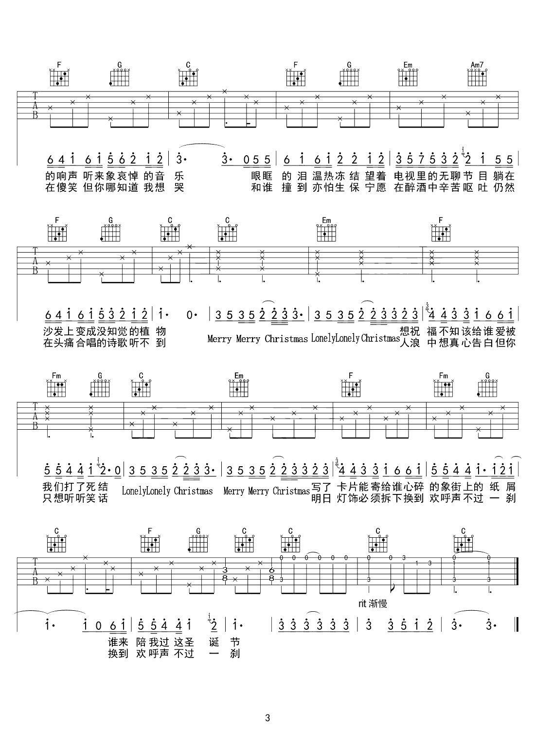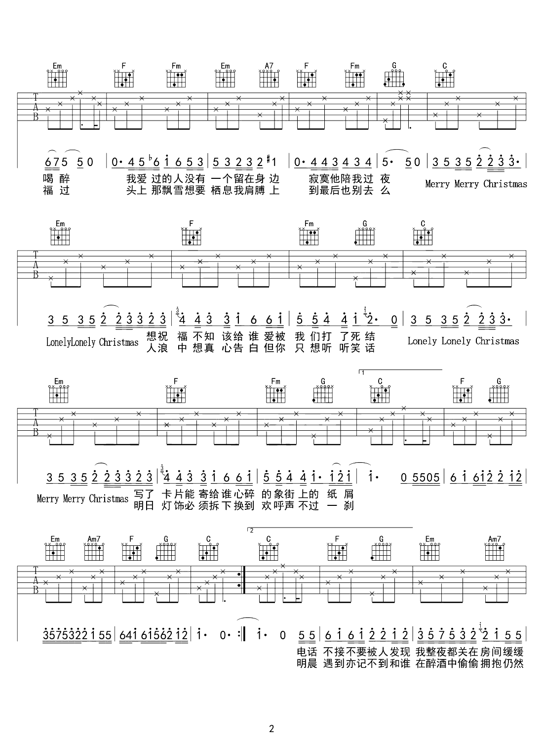 曲谱介绍: 陈奕迅的一首圣诞应景歌曲,每年圣诞来临时吉他爱好者必弹曲目。圣诞结吉他谱+Lonely Christmas吉他谱,国粤语两个歌词版本;六线谱选用C调和弦指法编配,如果是女生弹唱,可以使用变调夹夹3-5品。吉他弹唱谱共分三张图片谱例。