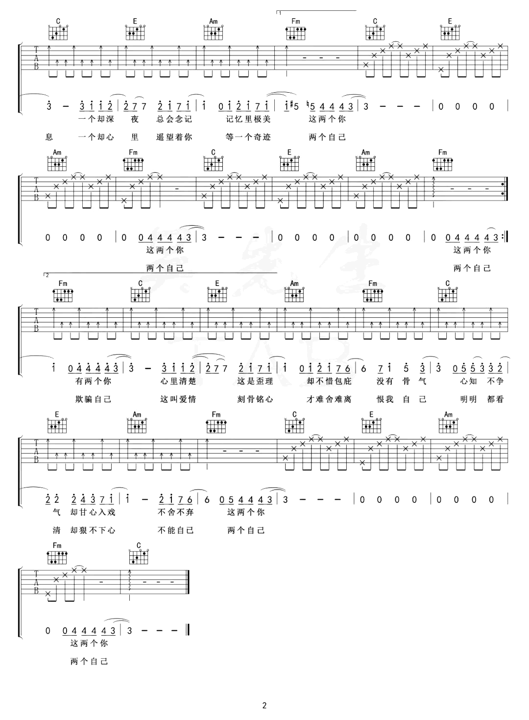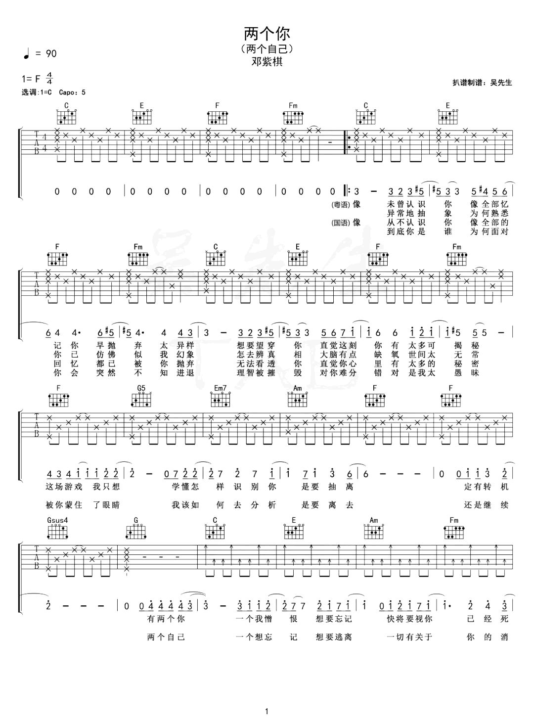 曲谱介绍: 邓紫棋的一首新歌,电视剧《飞虎之壮志英雄》的主题曲。两个你+两个自己吉他谱,国粤语两版歌词,原调F选调C,变调夹夹五品,两张图片弹唱六线谱。