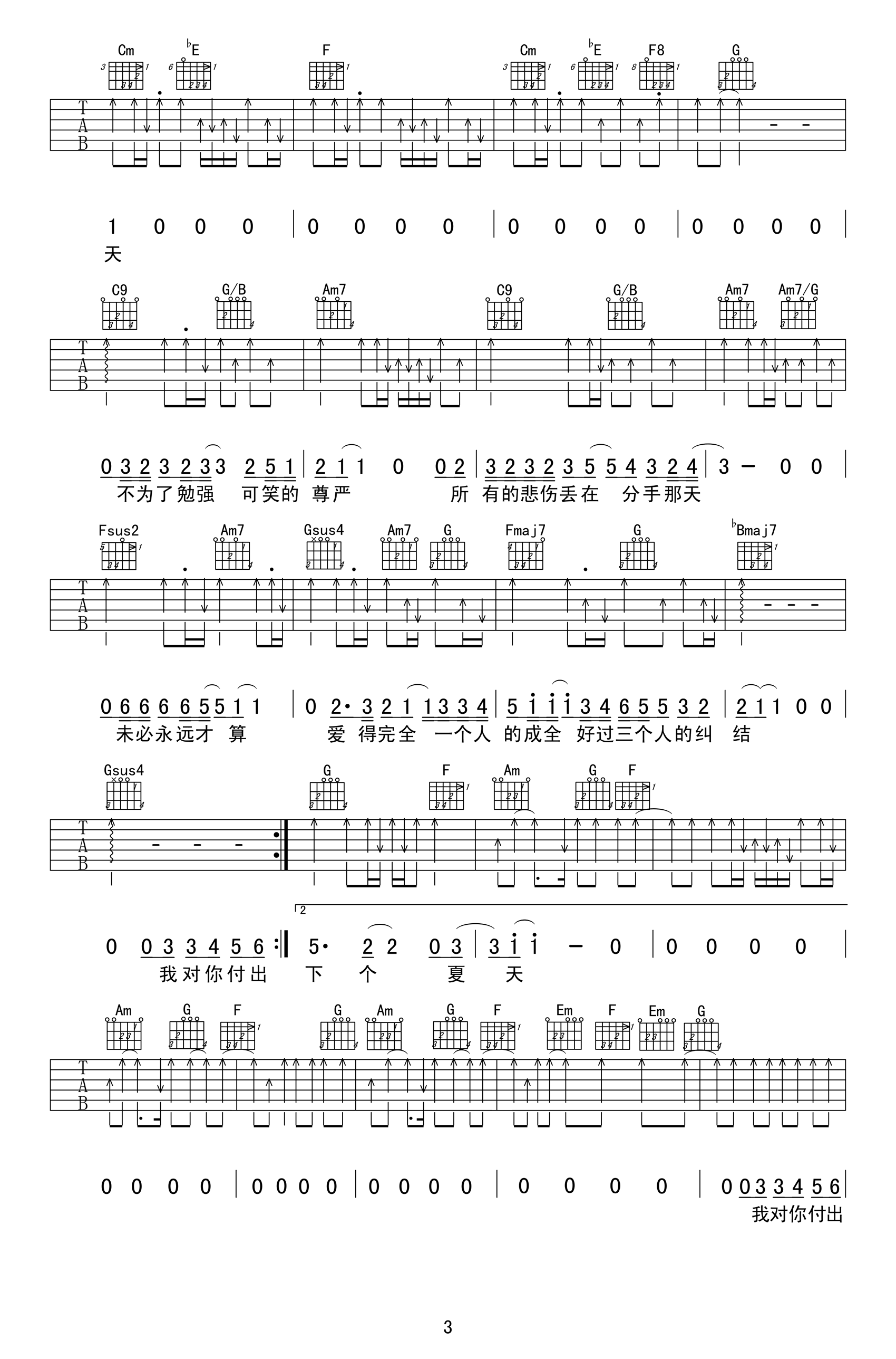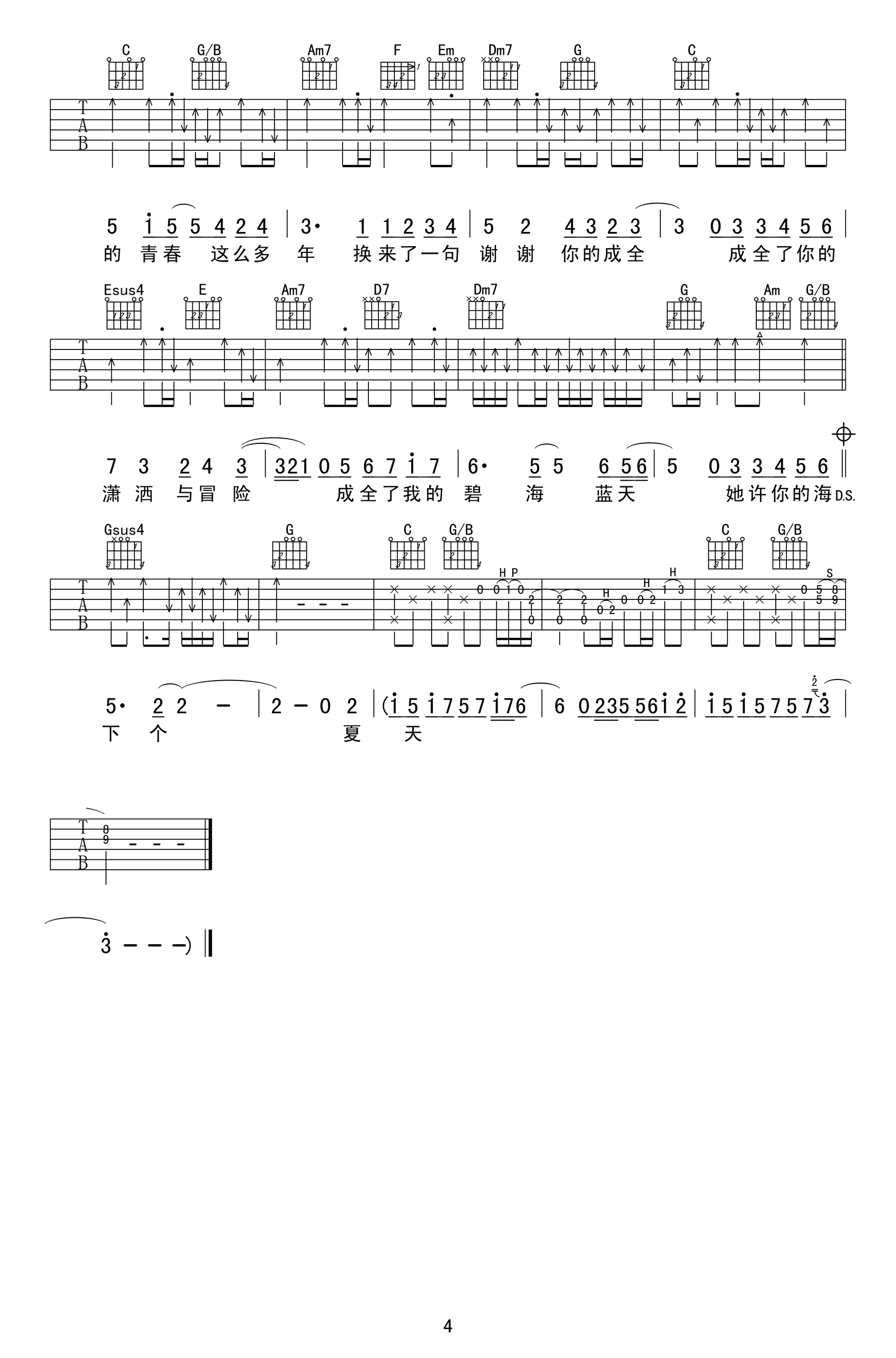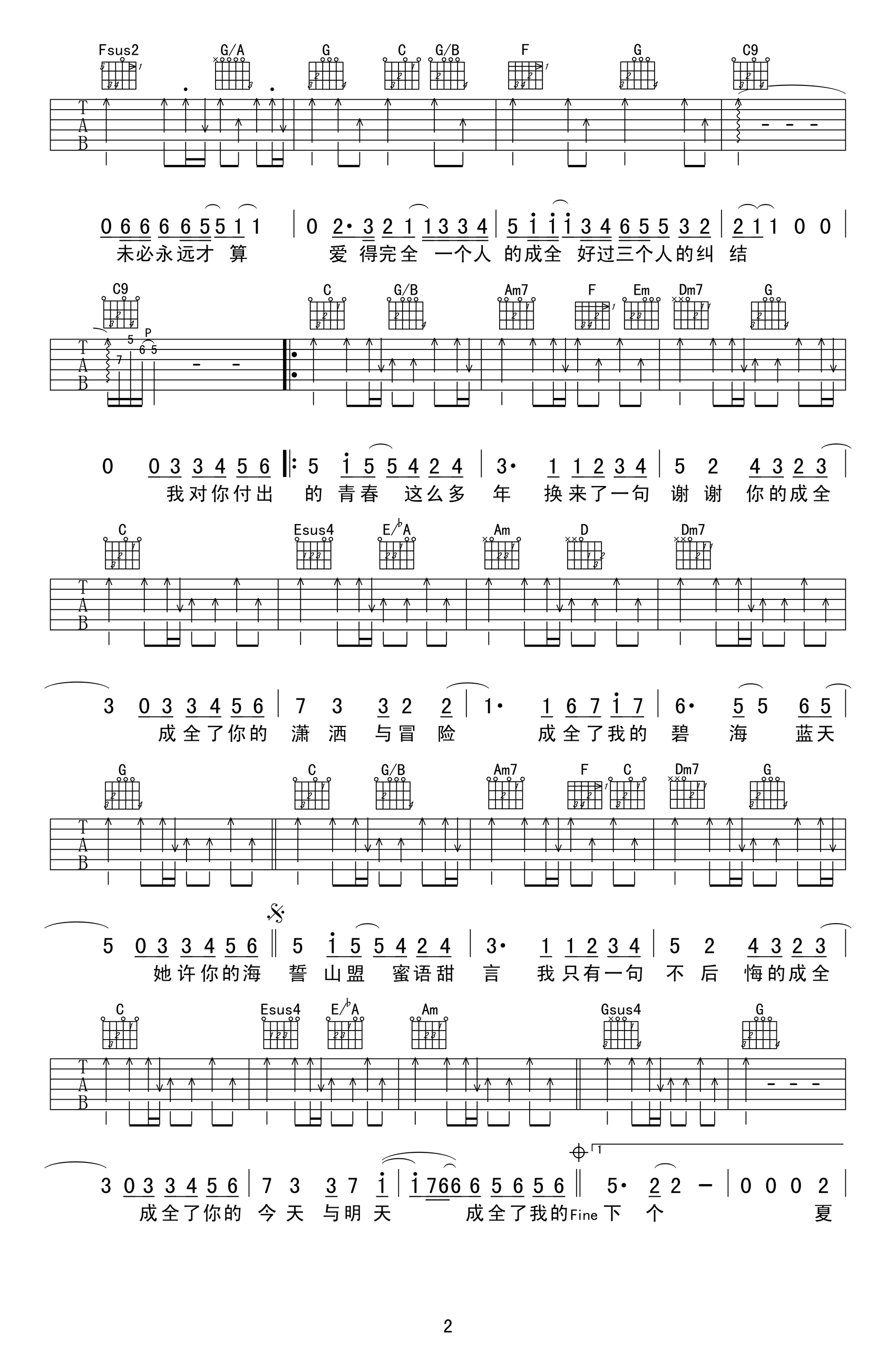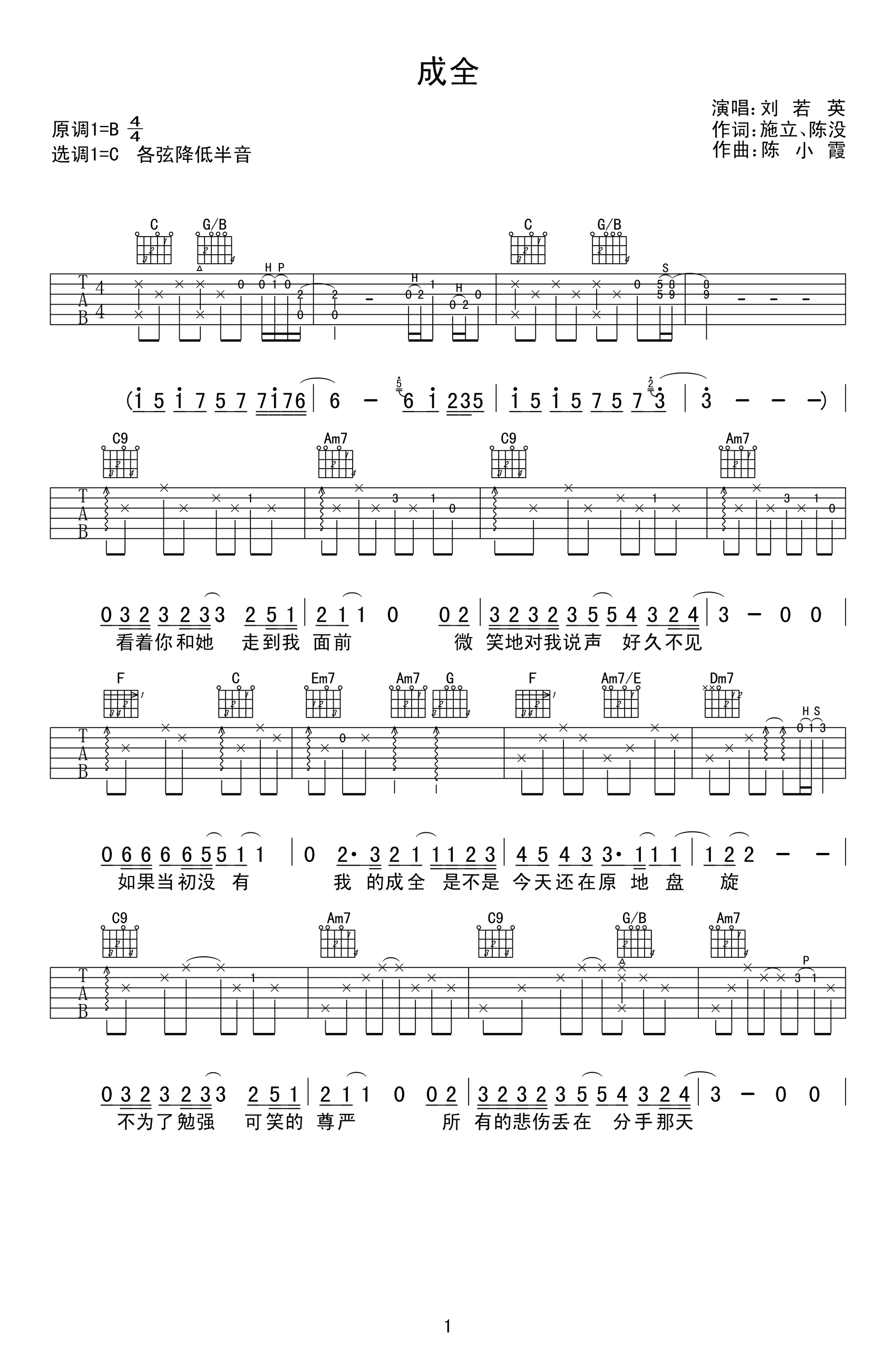 曲谱介绍: 刘若英演唱的一首经典歌曲,成全吉他谱,原调B选调C,各弦降半音,《成全》吉他弹唱谱,完整高清图片谱共四张六线谱例。