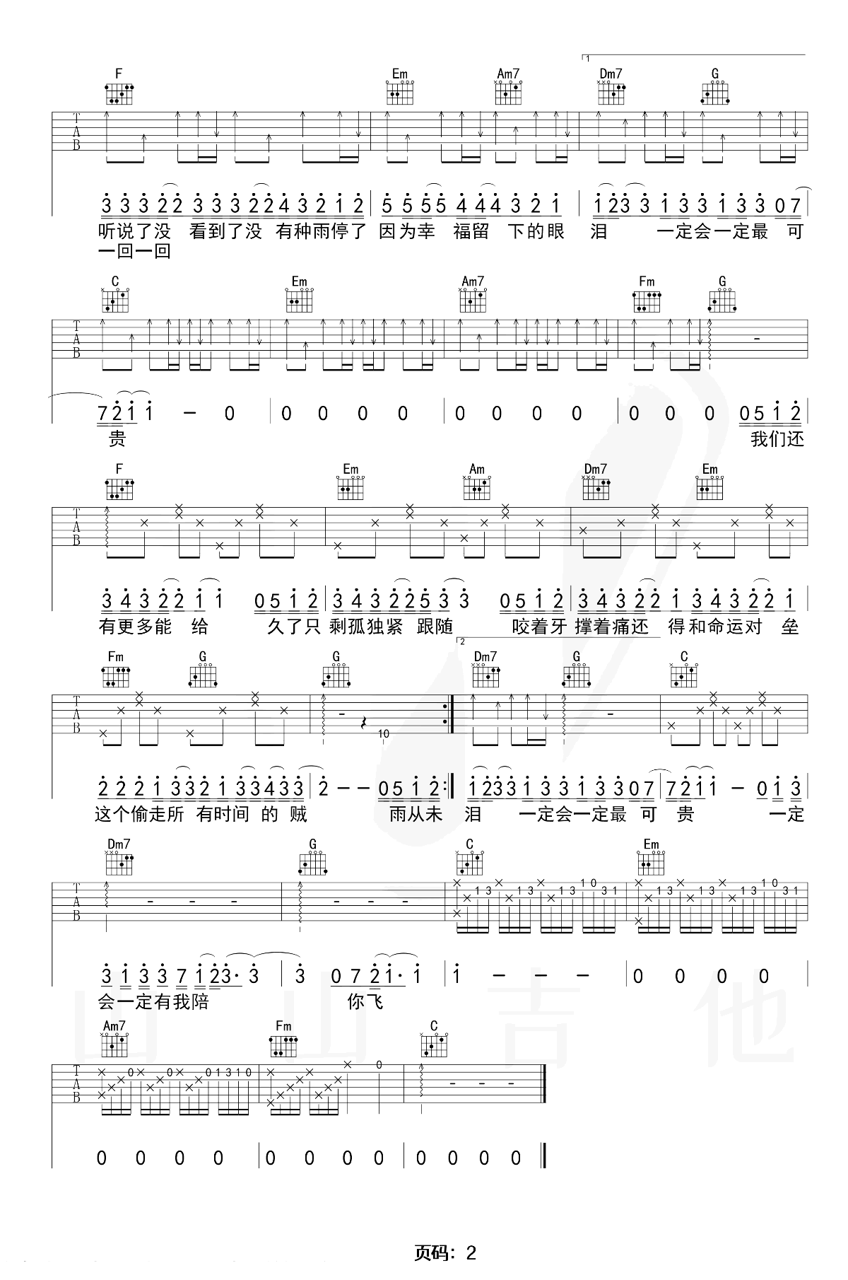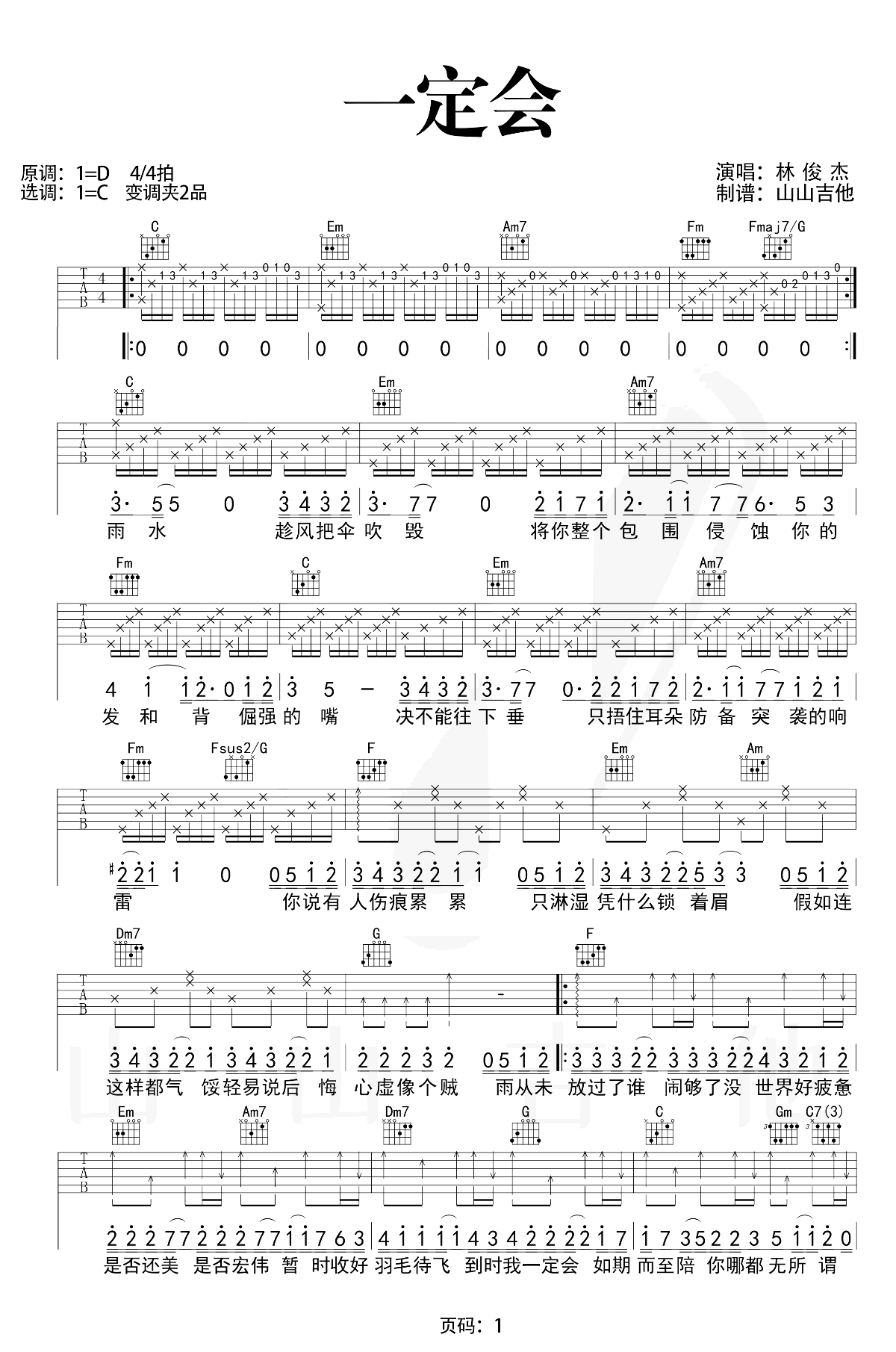 曲谱介绍: 一定会吉他谱,林俊杰的新歌单曲,原调D选调C,变调夹夹二品,两张图片六线谱。《一定会》吉他弹唱教学视频,琴友们跟随山山老师的示范讲解学习。