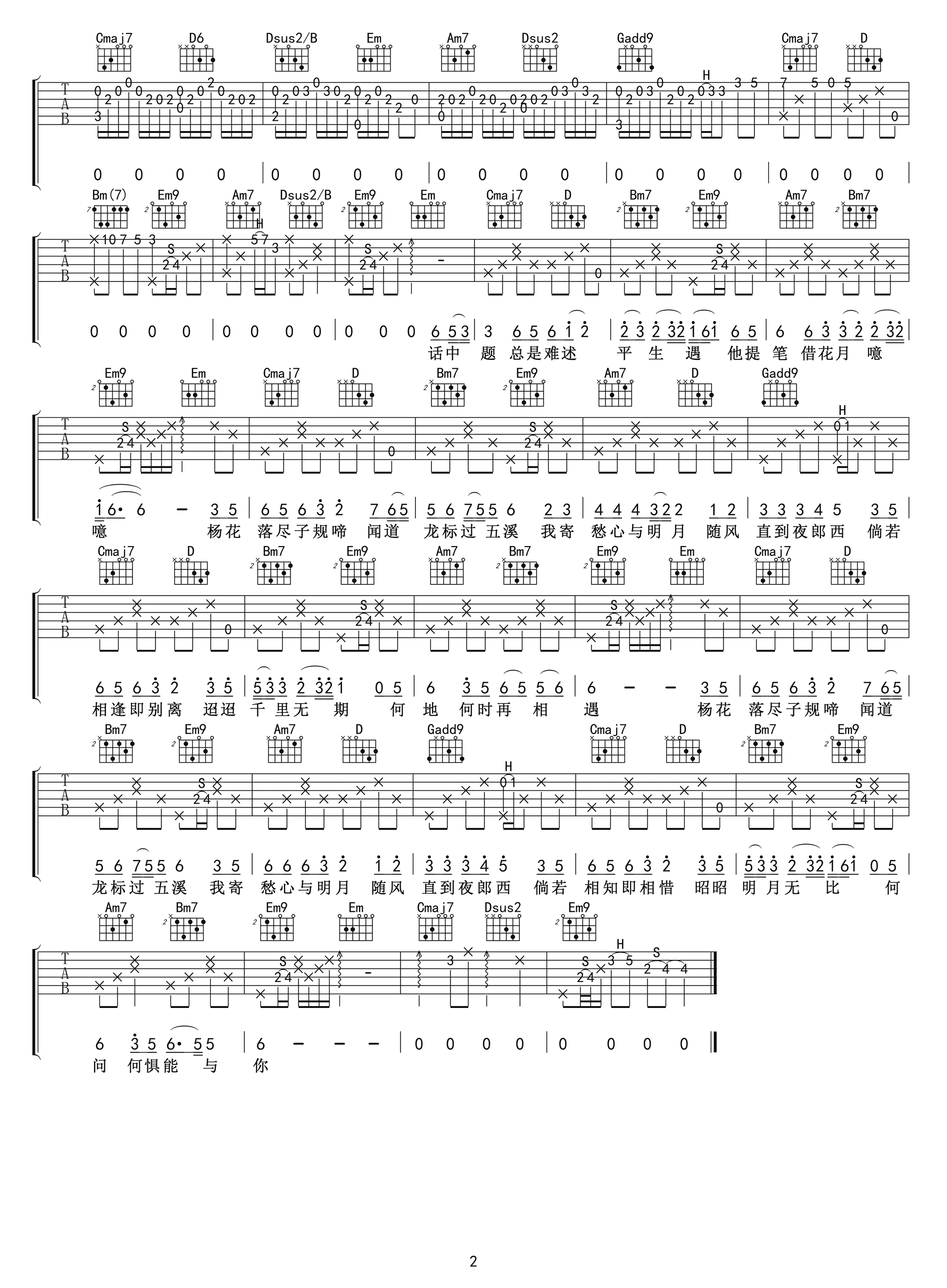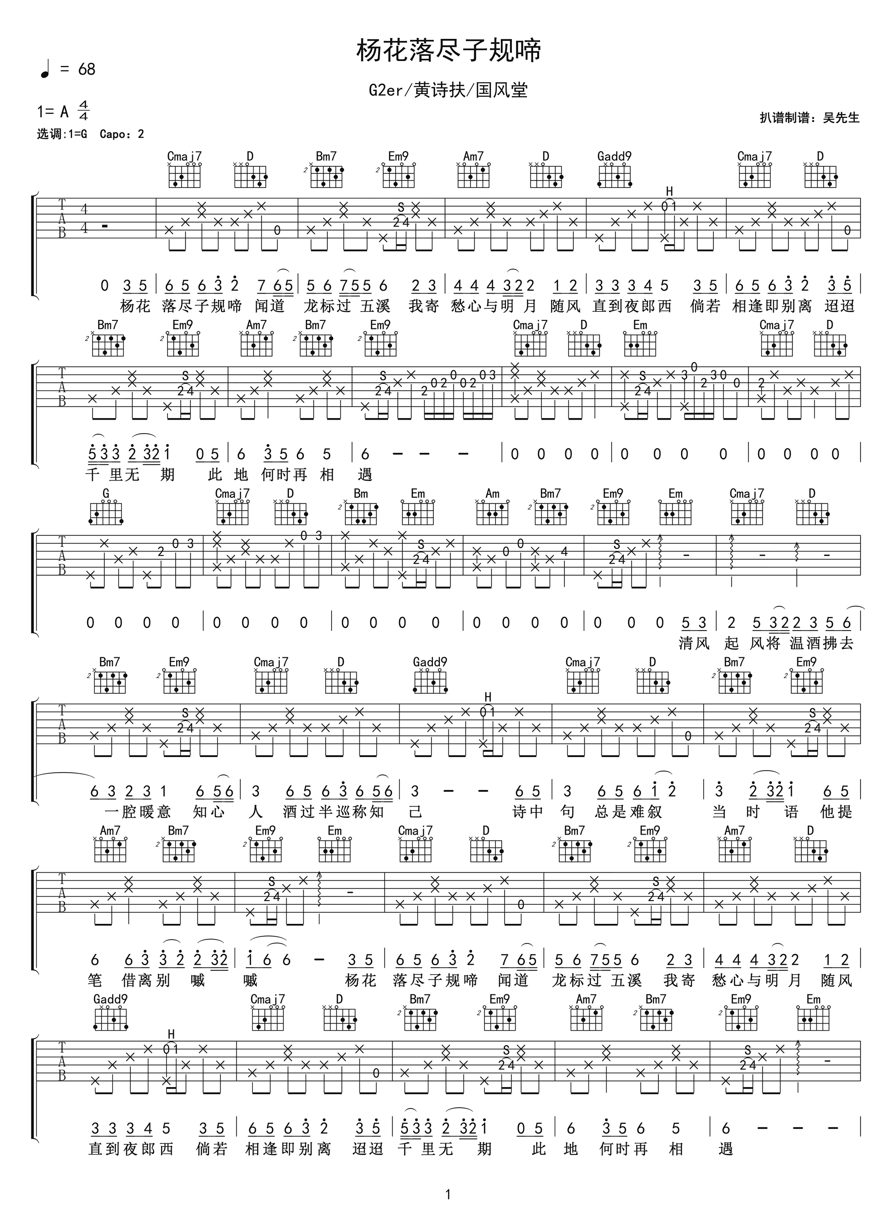曲谱介绍: G2er黄诗扶-国风堂的一首古风歌曲,杨花落尽子规啼吉他谱,原调A兄弟G,CAPO夹二品,《杨花落尽子规啼》吉他弹唱六线谱,两张高清图片谱。