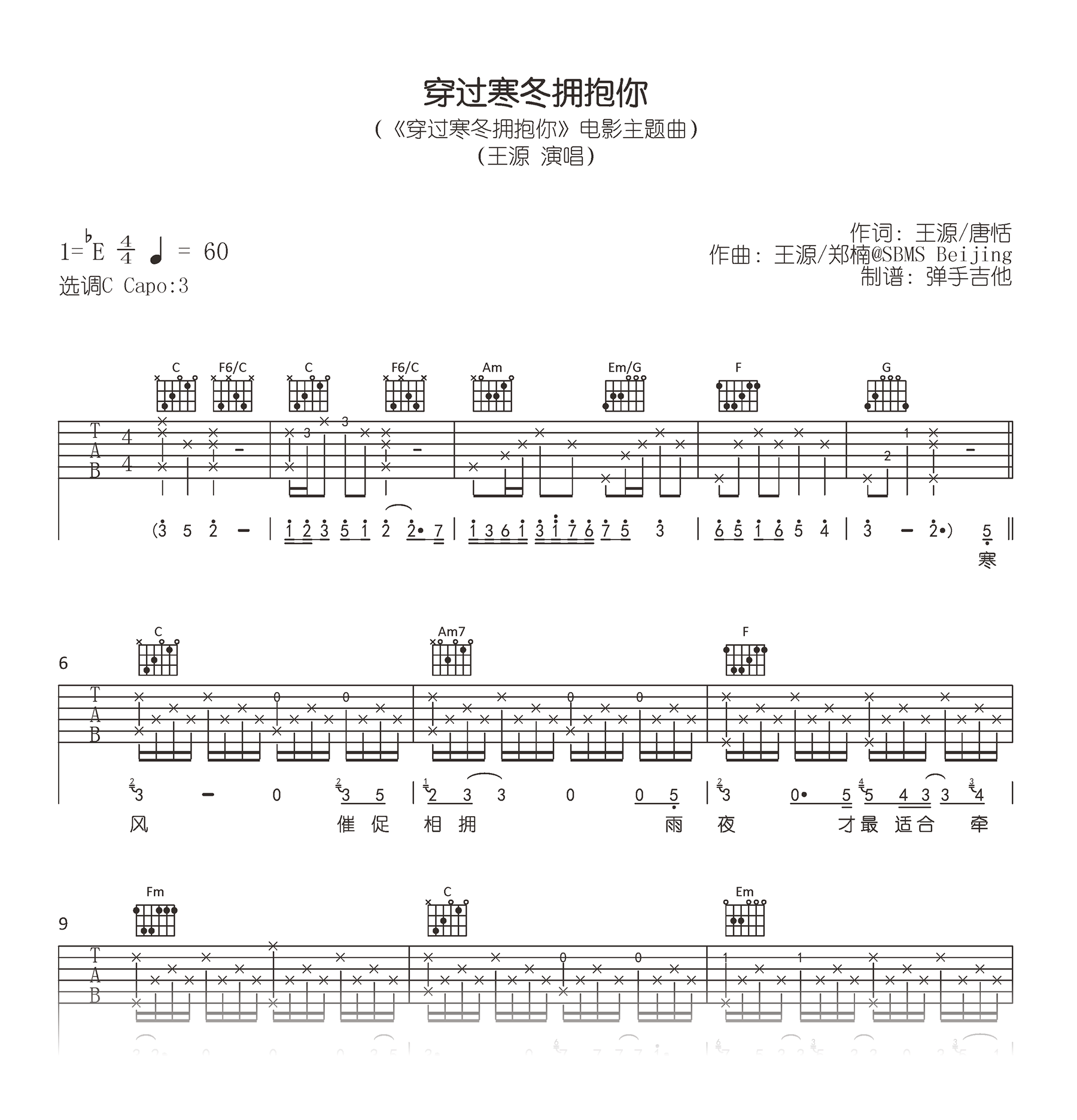 曲谱介绍: 穿过寒冬拥抱你吉他谱,王源献唱同名电影主题曲,《穿过寒冬拥抱你》吉他弹唱谱,原调bE调,选用C调和弦指法编配,Capo夹三品,完整版共三张高清图片六线谱。这是一首最暖冬日情歌,温柔治愈的歌声穿过寒冬,为我们带来最温暖的告白和祝福,注入了真实情感的歌曲里,总能轻易温暖到听歌的人。我想穿过人群,穿过城市,穿过寒冬奔向你,拥抱你。