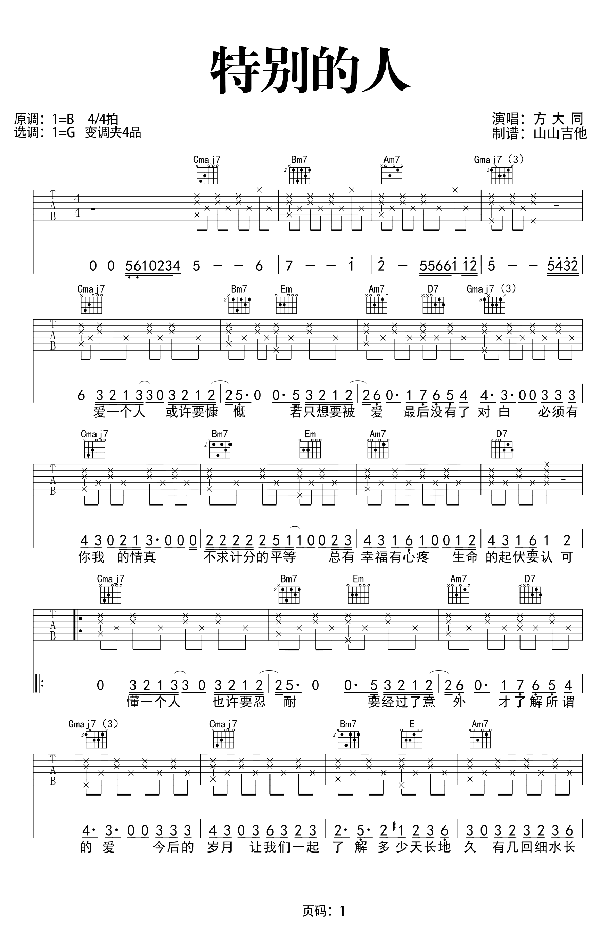 曲谱介绍: 特别的人吉他谱,方大同的一首会在心底不断回荡的慢板抒情歌曲。原调B选调G,变调夹夹四品,两张图片六线谱。《特别的人》吉他弹唱演示和教学视频,琴友们参照山山老师的讲解示范练习。