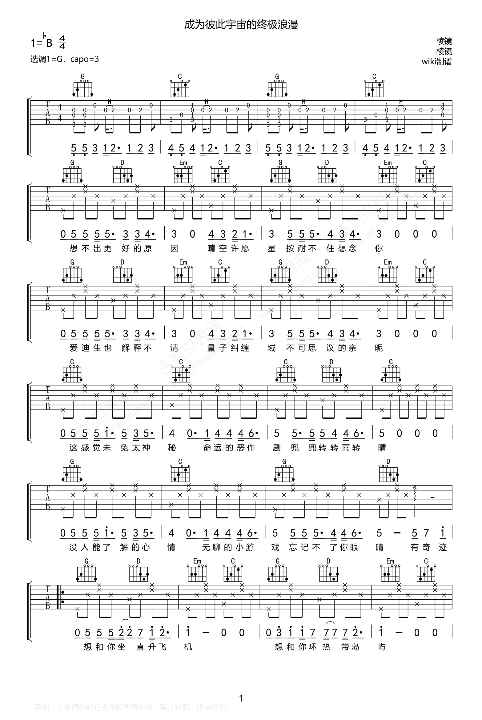 曲谱介绍: 棱镜乐队演唱,成为彼此宇宙的终极浪漫吉他谱,欢快的节奏加上爆表的糖分就像含了满口的跳跳糖。歌曲原调降B选调G,Capo夹三品。《成为彼此宇宙的终极浪漫》吉他弹唱六线谱,三张高清图片谱例。