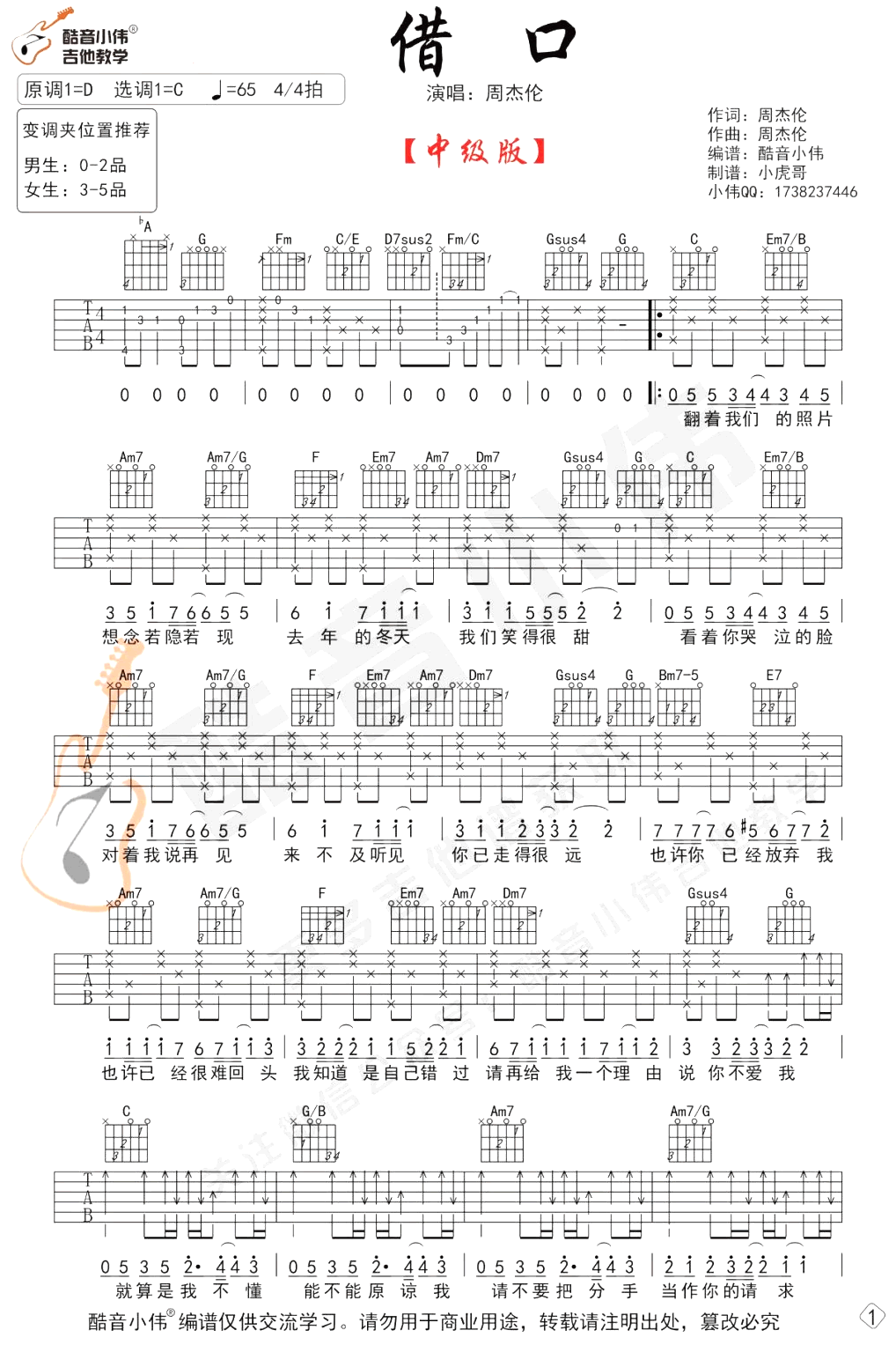 曲谱介绍: 周杰伦的催泪经典情歌《借口》吉他谱,原调D选调C,变调夹推荐,男生0-2品女生3-5品,两张图片六线谱。曲谱为中级版编配,适合进阶练习,同学们可以跟着老师的视频教学分小节逐步学习。