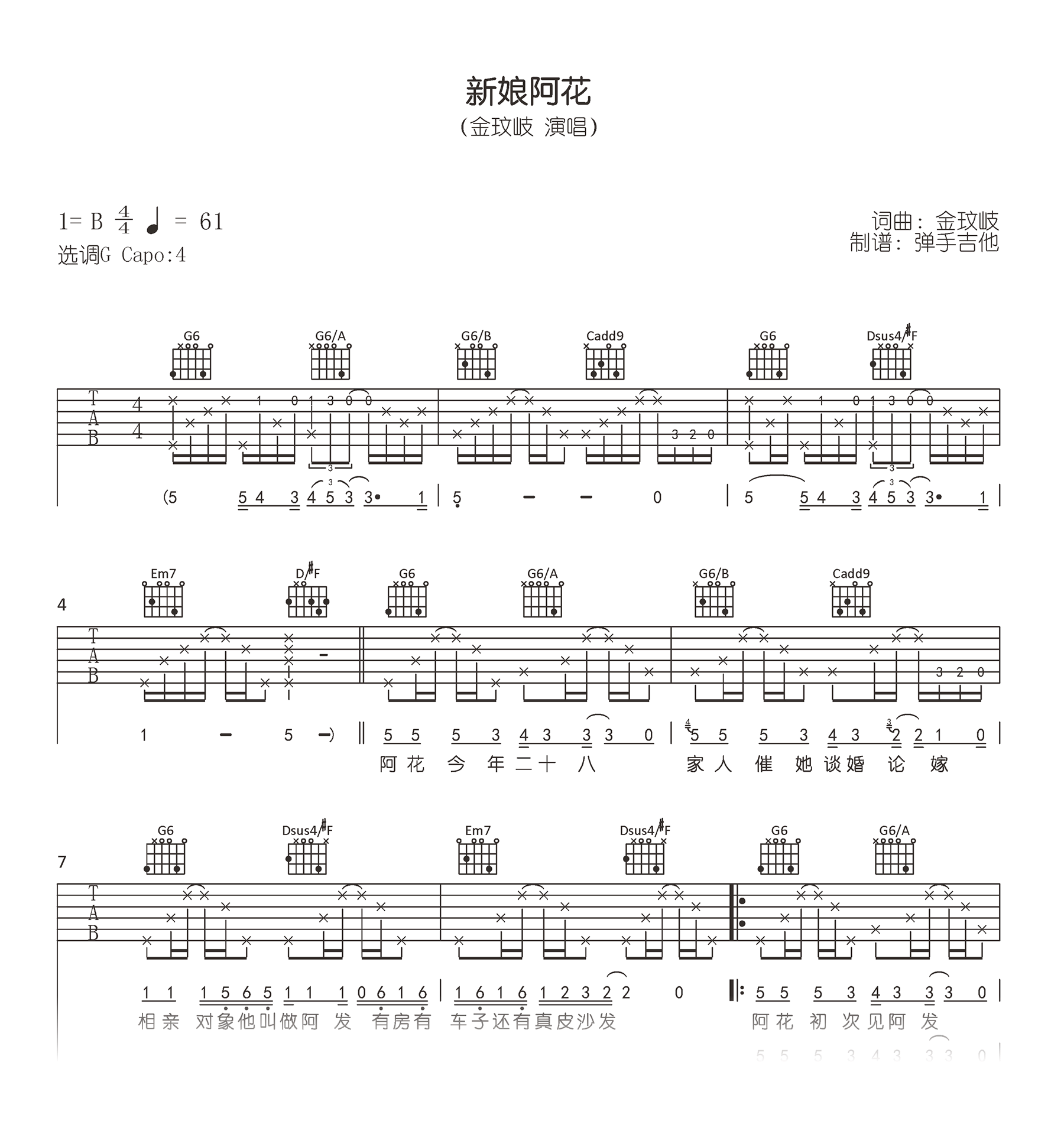 曲谱介绍: 金玟岐的一首关于相亲主题的歌曲,新娘阿花吉他谱,原调B选调G,CAPO夹四品,《新娘阿花》吉他弹唱谱,完整编配共三张高清图片六线谱。