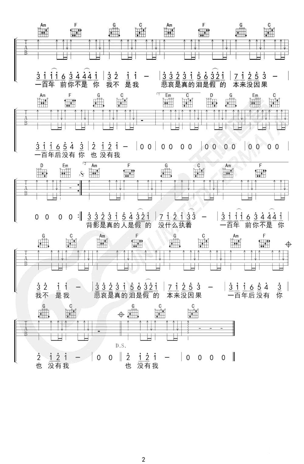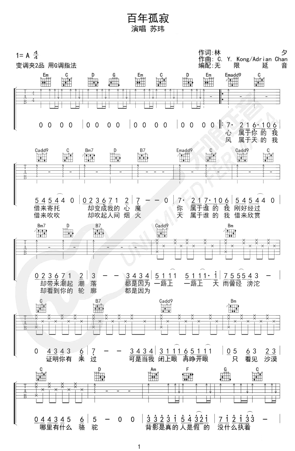 曲谱介绍: 百年孤寂吉他谱,苏玮翻唱王菲的一首老歌突然在某音走红。《百年孤寂》吉他弹唱六线谱,原调A,变调夹夹二品,选用G调指法,两张图片谱例。