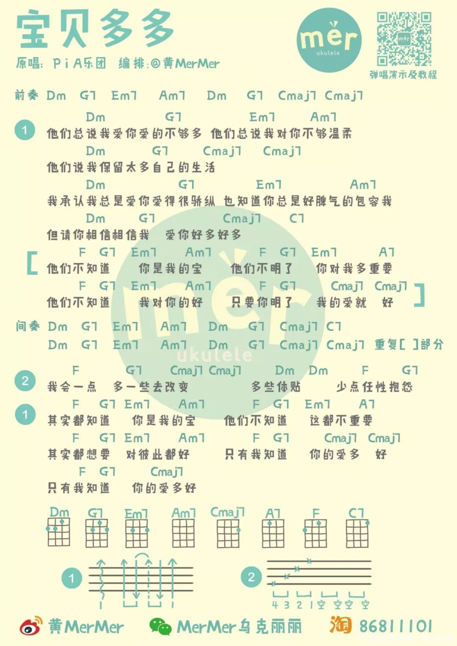 曲谱介绍: MerMer说 来自台湾一个小众音乐组合PiA乐团的小甜歌「宝贝多多」,教给大家~超推荐给新手!教学里面也有教两个不同的弹唱版本~一个是我的弹唱版本,一个是比较贴近原版的,学起来!!   弹唱演示   弹唱教学   《宝贝多多》尤克里里谱