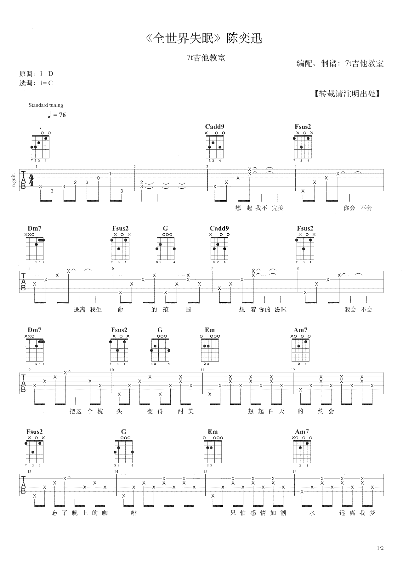 曲谱介绍: 陈奕迅演唱,全世界失眠吉他谱,这首歌的原调是D大调,用的是C大调的指法来编配,相对来说还是很简单滴,如果觉得Fsus2比较难按,也可以改成自己比较熟悉的F和弦。视频里是标准音调弦,没有使用变调夹。想弹原调的话使用变调夹夹在第2品就可以~这首歌的和弦进行用的都比较简单,除了一些和弦色彩的运用比如一级用的add9,四级用的sus2等等,其它没有太多可以讲的,这期就不做太详细的和弦分析啦~