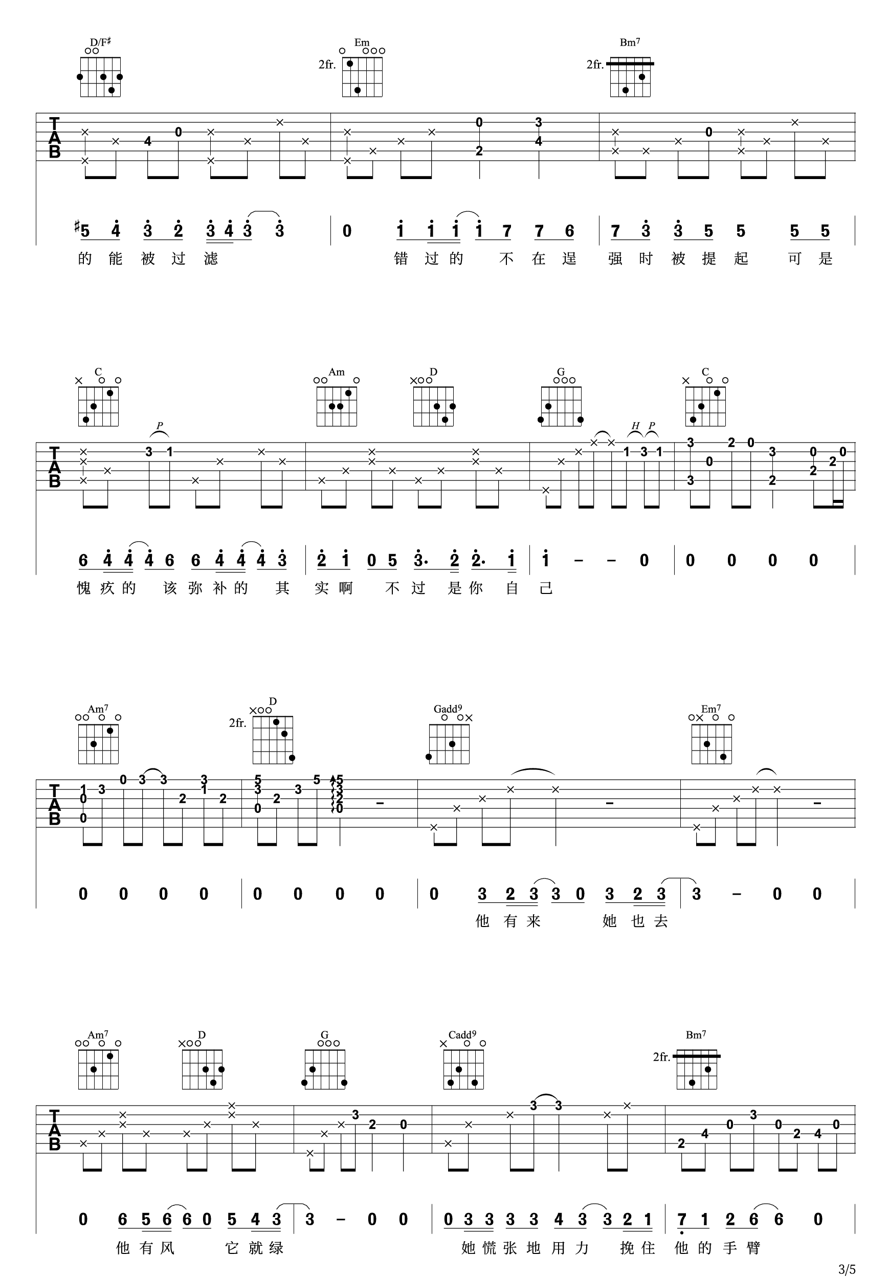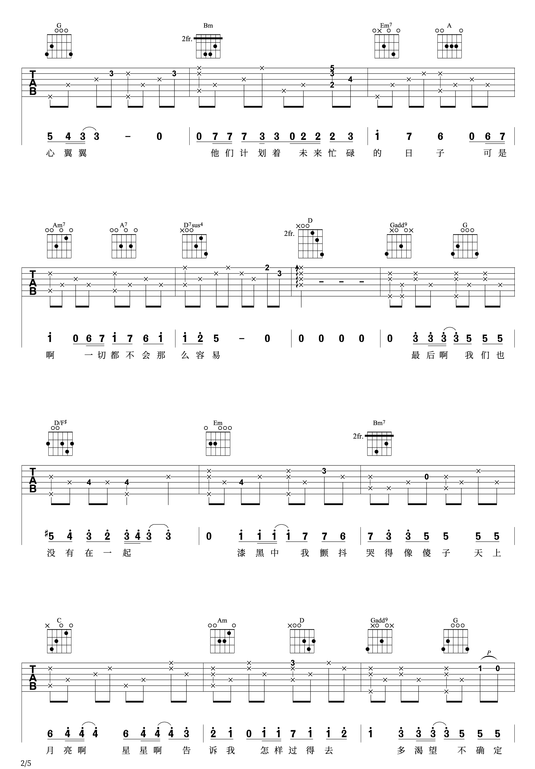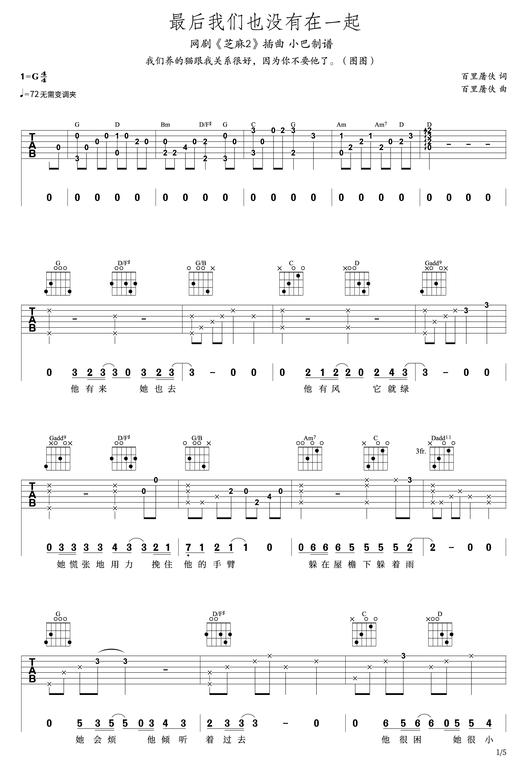 曲谱介绍: 最后我们也没有在一起吉他谱,百里屠伕网剧《芝麻2》插曲,选用G调和弦原调编配,不用变调夹。《最后我们也没有在一起》吉他弹唱谱,完整版共五张图片六线谱。