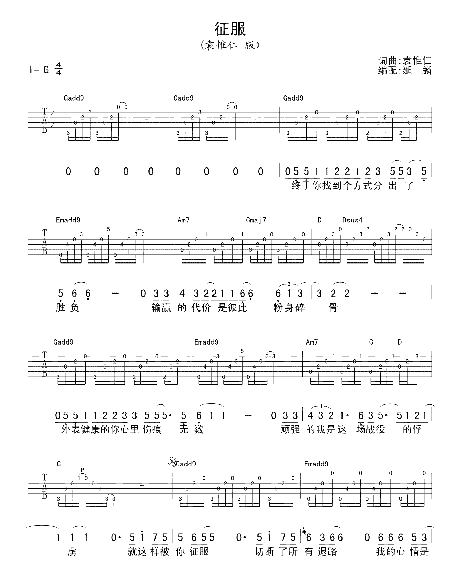 曲谱介绍: 袁惟仁的经典创作,那英的一首代表歌曲,征服吉他谱,选用G调和弦指法,《征服》吉他弹唱谱,本曲谱根据袁惟仁版本编配,完整高清图片谱两张谱例。