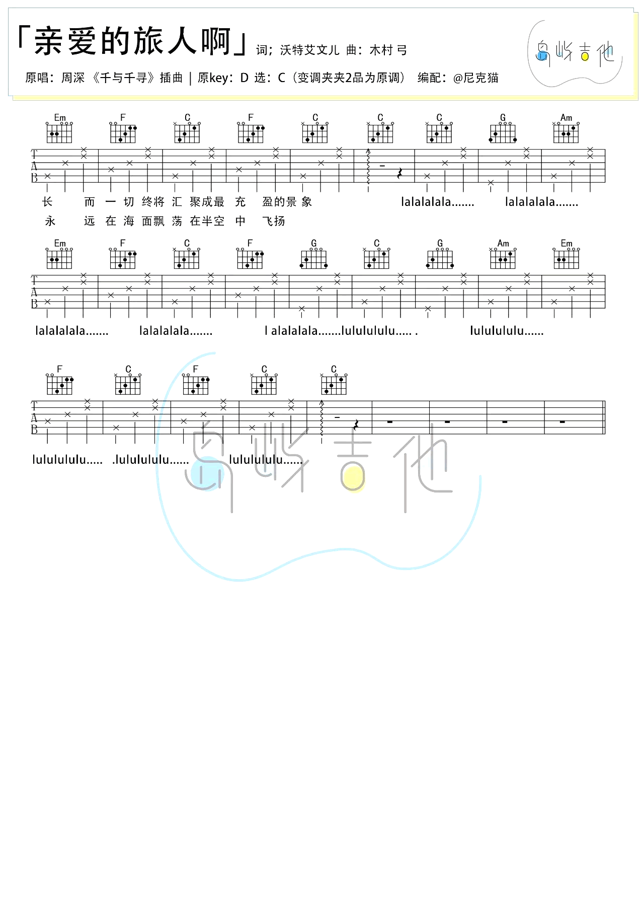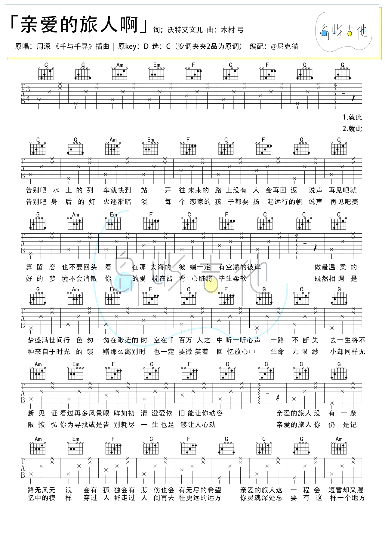 曲谱介绍: 周深《千与千寻》吉他弹唱谱,共有2张高清图谱,免翻页排版设计。