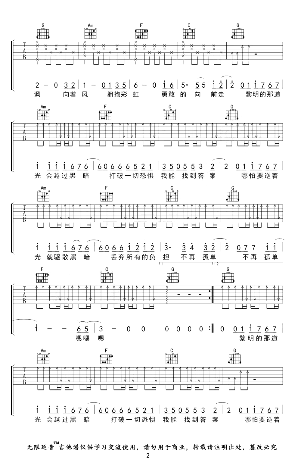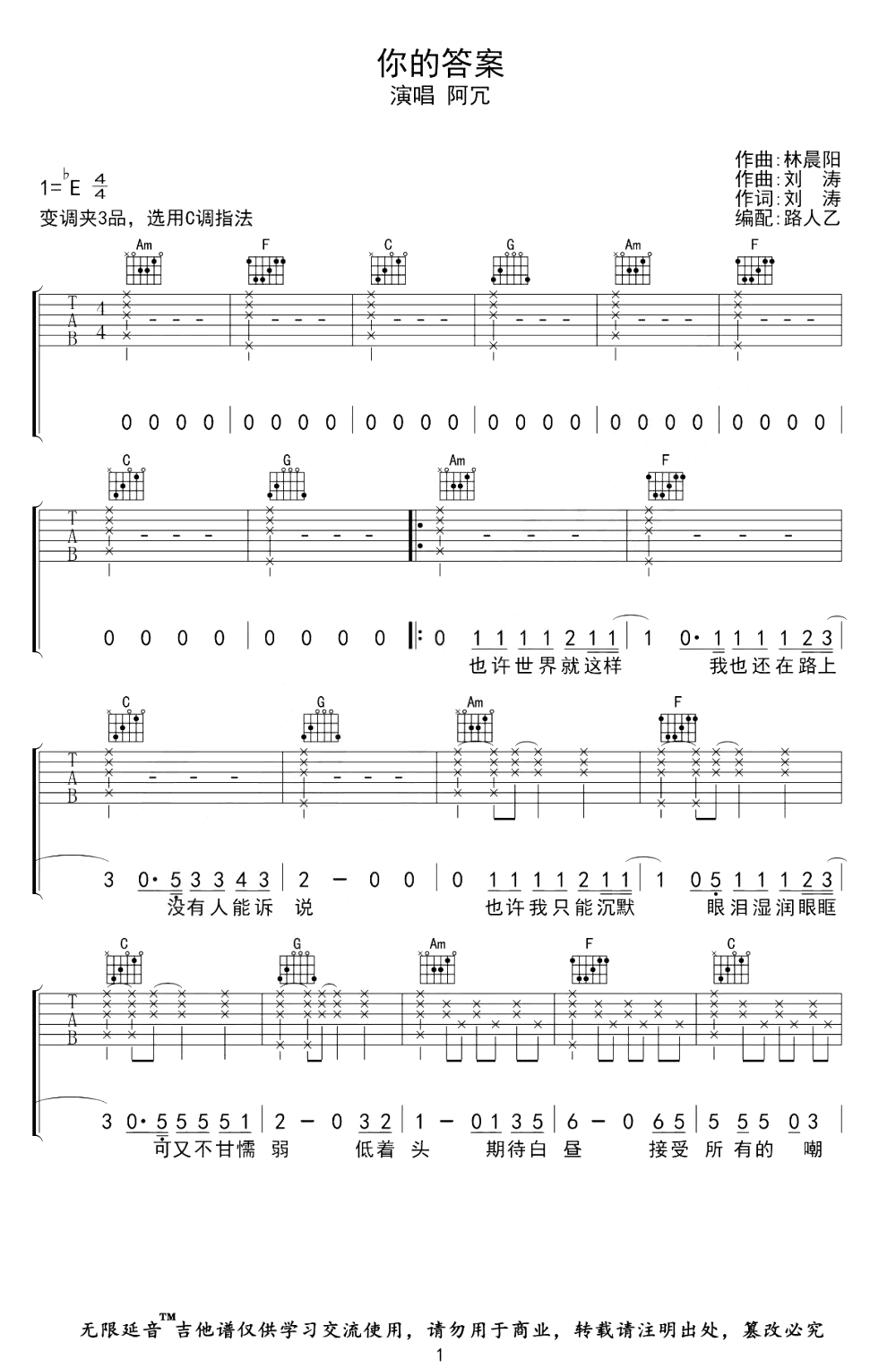曲谱介绍: 阿冗的一首网络热门歌曲,闪耀着催人奋进的光芒和力量。你的答案吉他谱,原调降E选调C,变调夹夹三品。《你的答案》吉他弹唱六线谱,三张图片谱例。