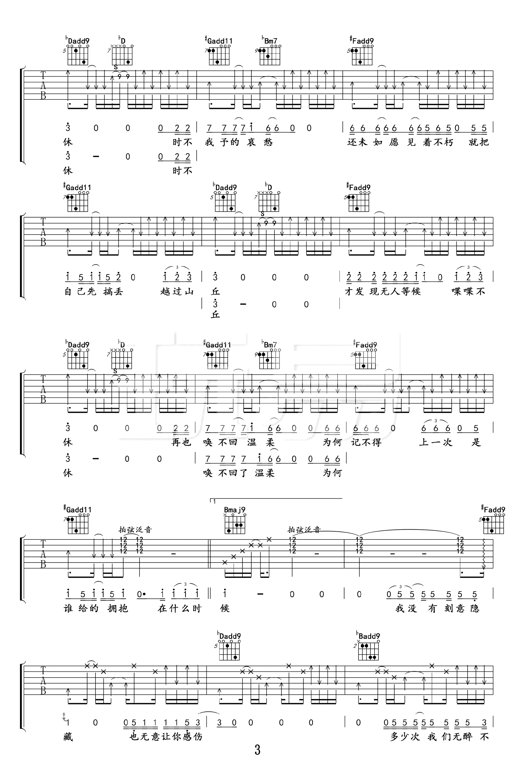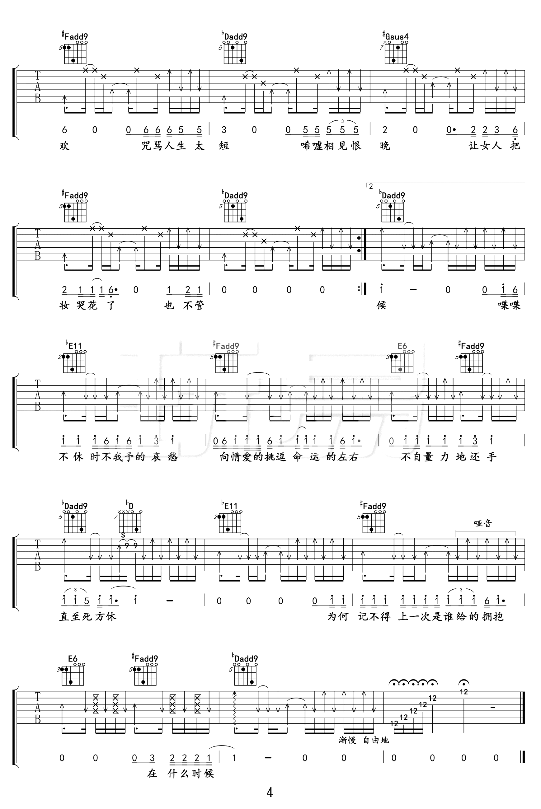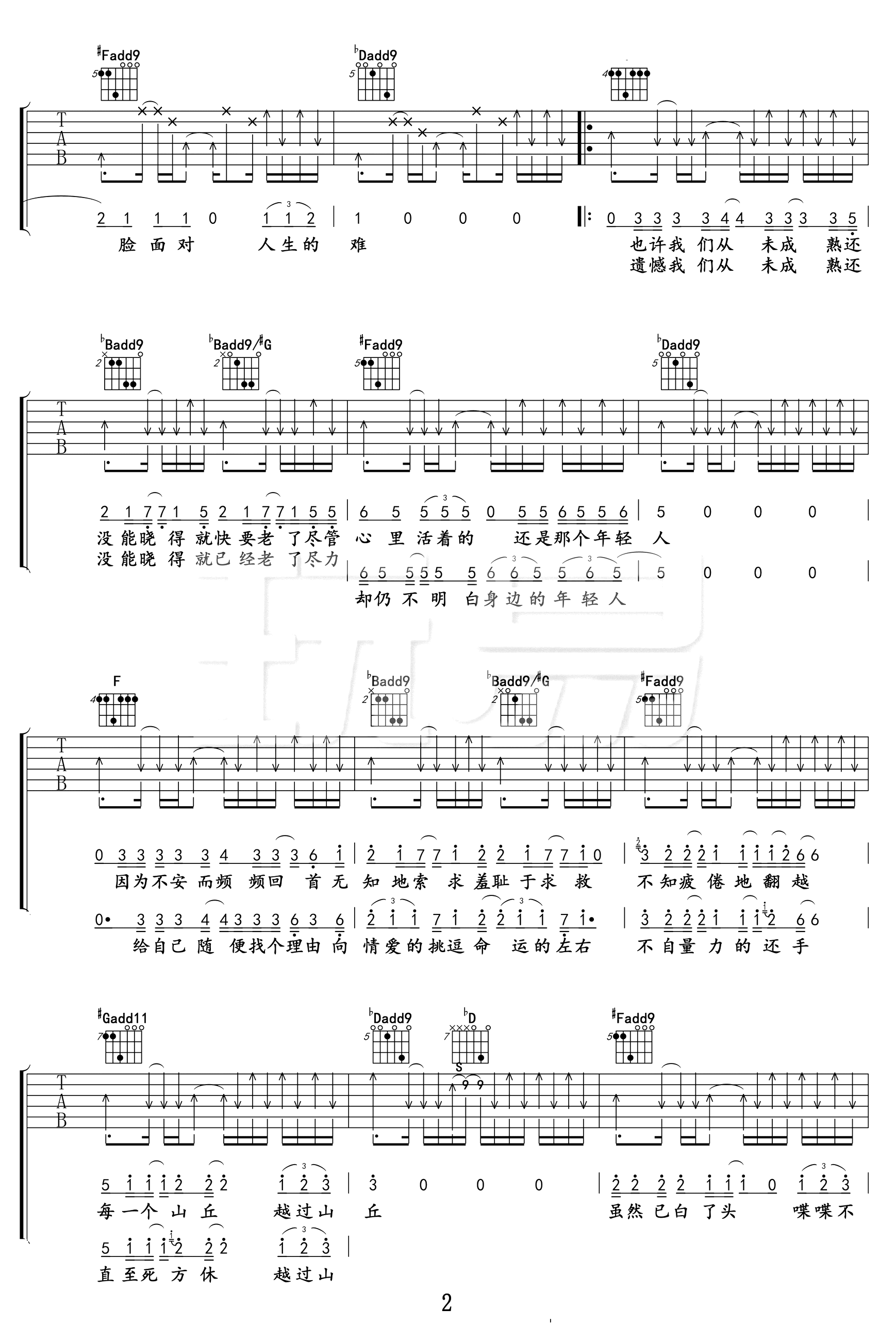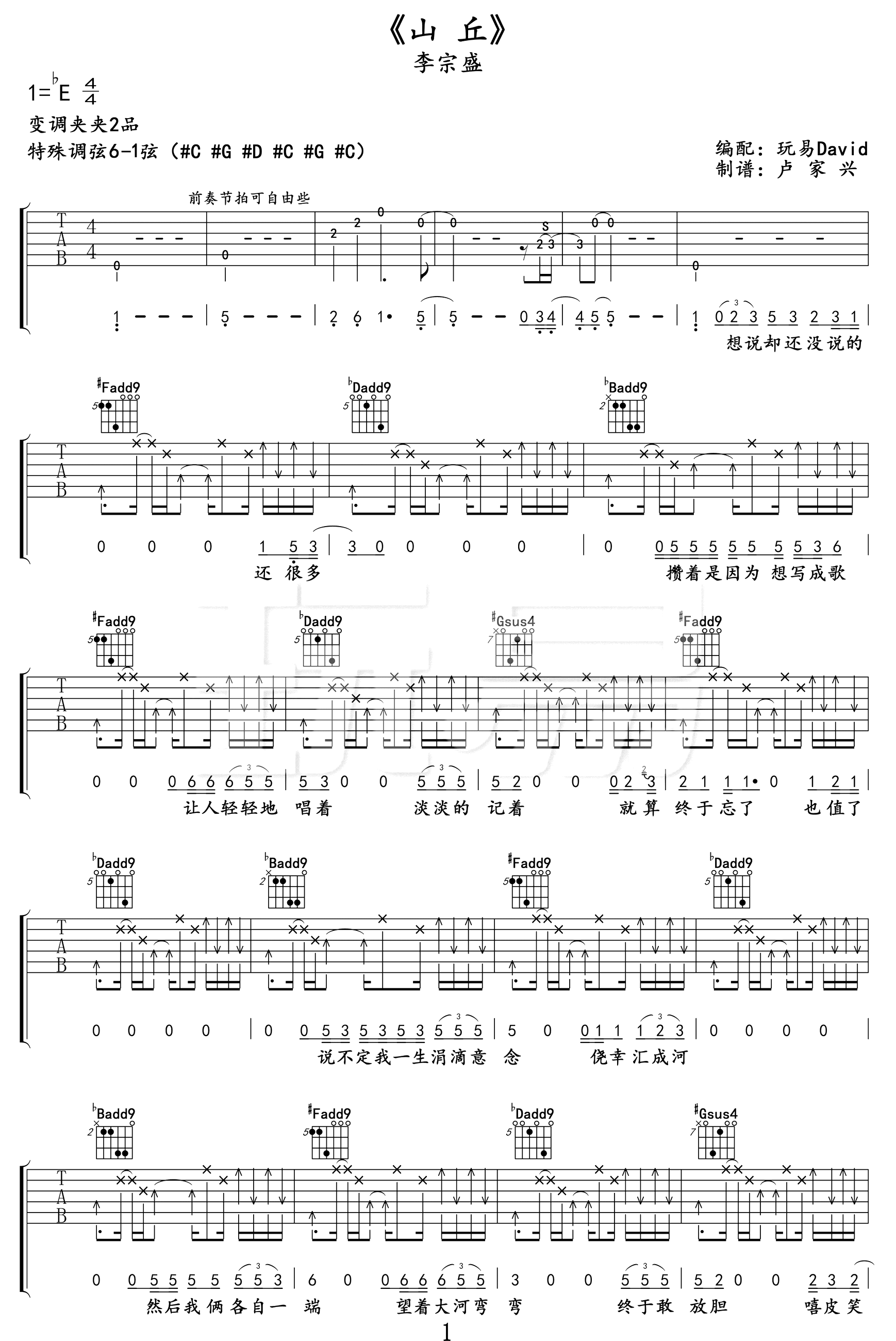 曲谱介绍: 山丘吉他谱,李宗盛的一首经典代表歌曲,原调降E,变调夹夹二品,特殊调弦编配,共四张高清图片六线谱。附《山丘》吉他弹唱视频,琴友们参照练习。