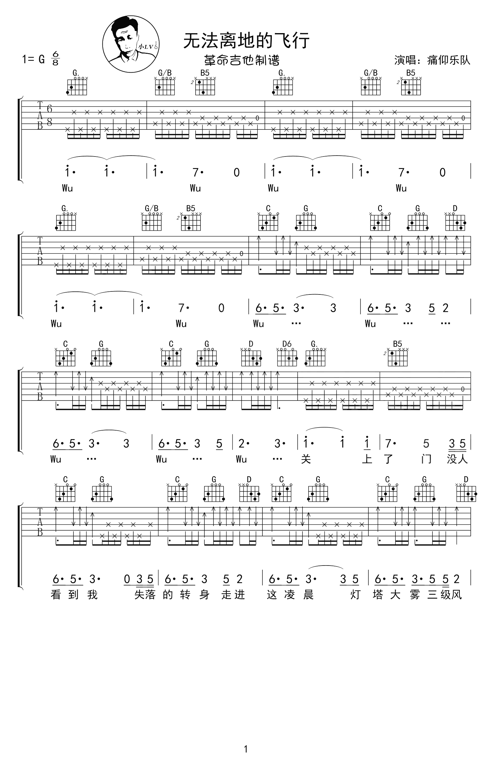 曲谱介绍: 痛苦的信仰乐队演唱,韩寒导演的电影《四海》插曲,无法离地的飞行吉他谱,选用G调和弦指法,弹唱六线谱完整版共五张高清图片谱例。