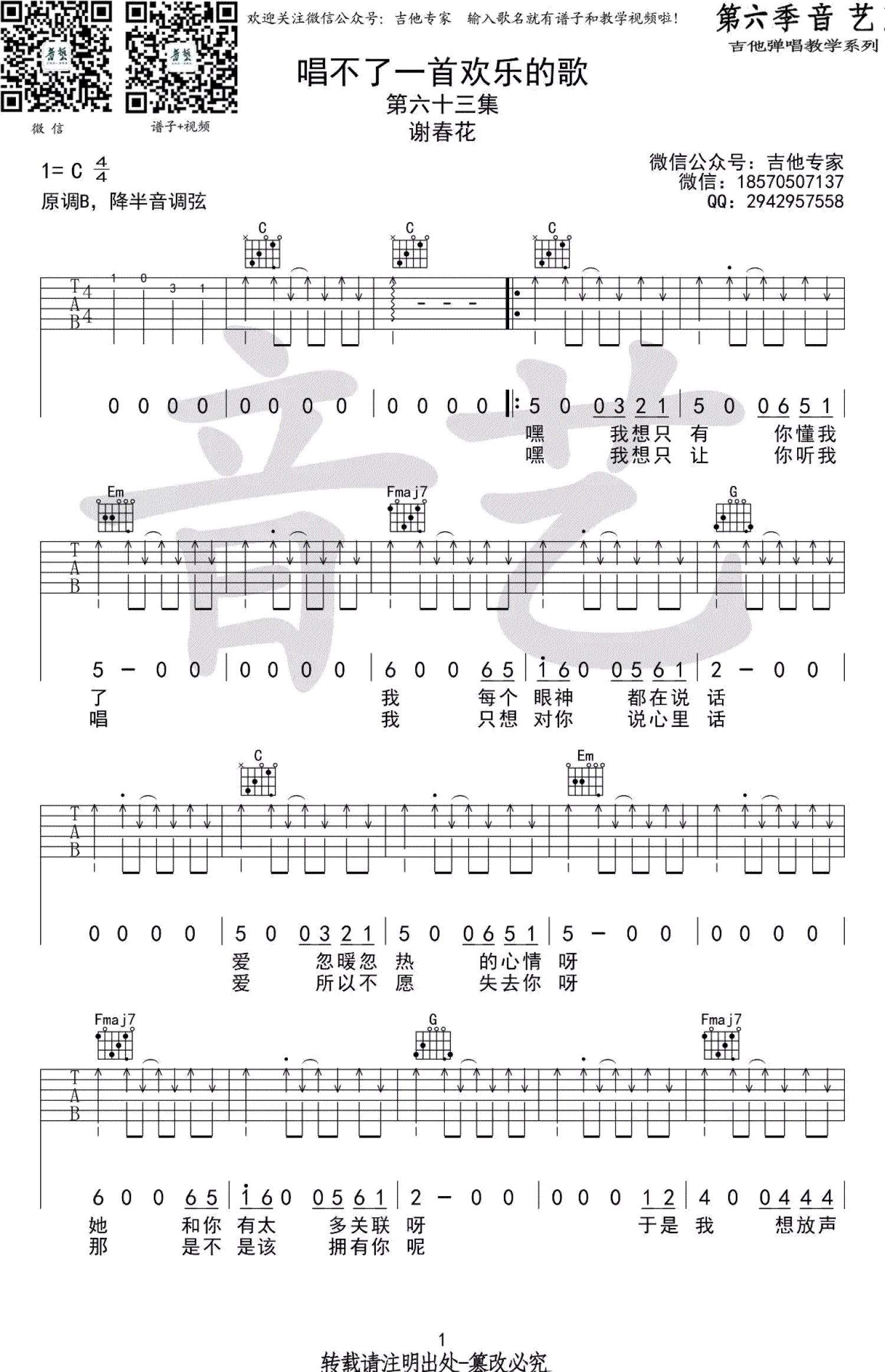 曲谱介绍: 谢春花《唱不了一首欢乐的歌》吉他谱,C调弹唱谱。这首歌曲是尤克里里伴奏的,挺简单,老师编配成吉他谱,大家如果要用尤克里里弹奏的话,把和弦转换成尤克里里的就好了,右手的节奏都是一样的!只是这首歌曲是B调,原版尤克里里也是降半音调弦!