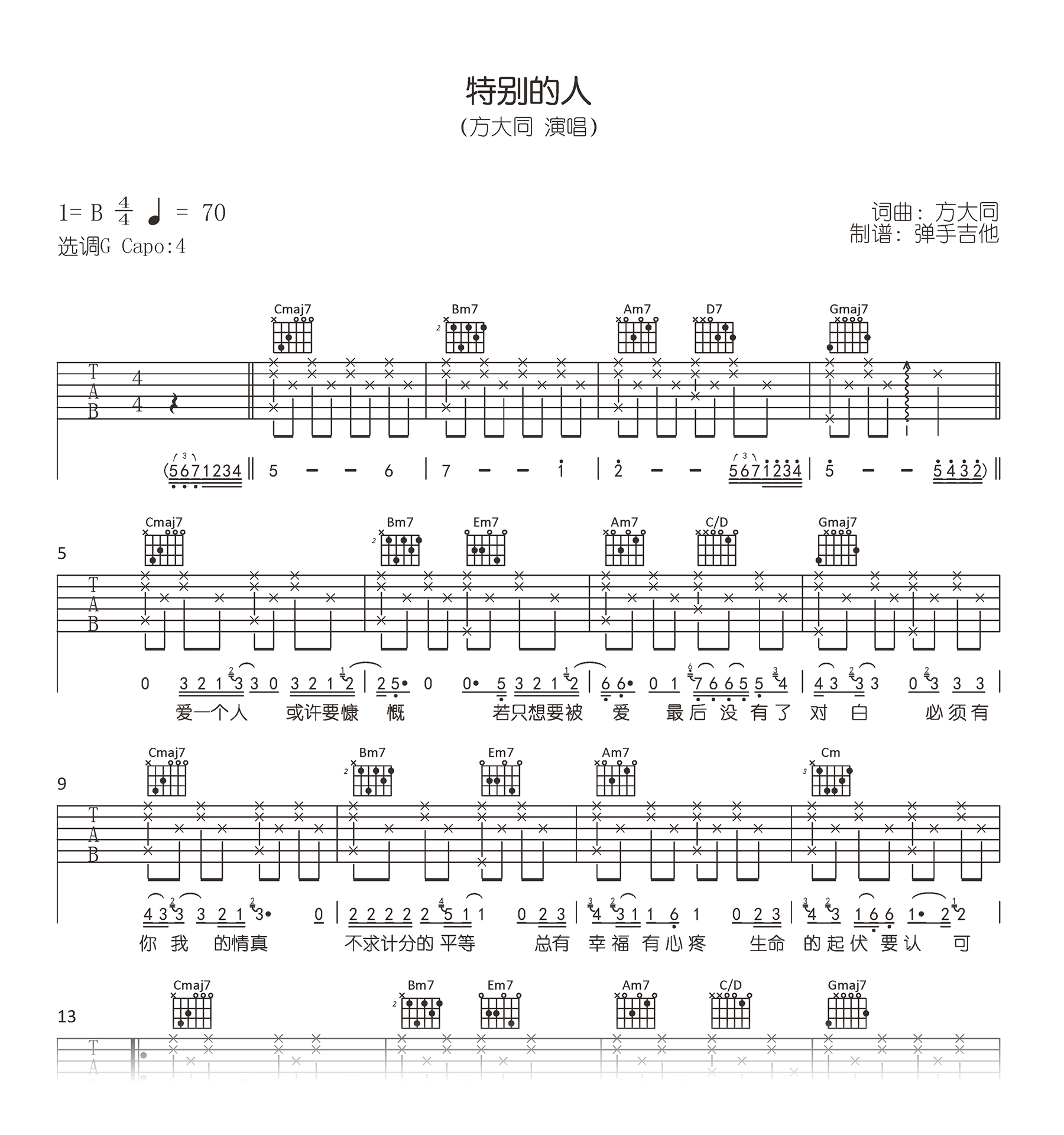 曲谱介绍: 特别的人吉他谱,方大同经典代表作品,《特别的人》吉他弹唱谱,原调B,选用G调和弦编配,Capo夹四品,完整版共两张高清图片谱。