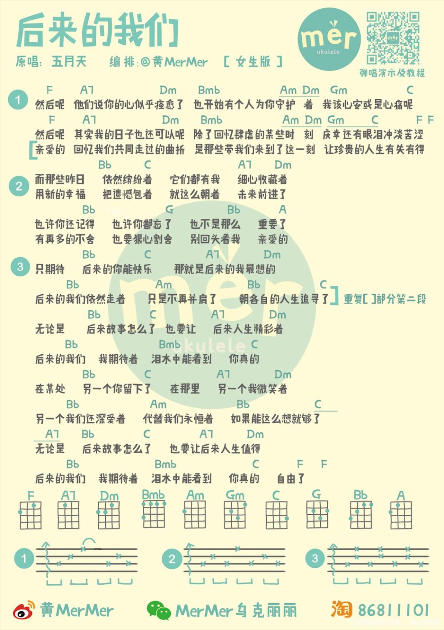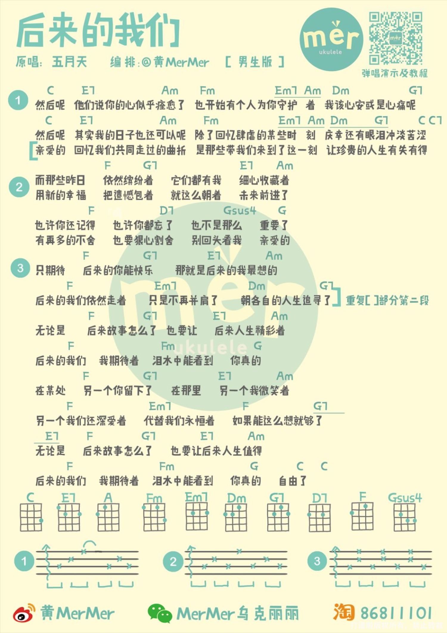 曲谱介绍: MerMer说 《后来的我们》是同名电影的主题曲,是五月天的一首旧歌~这次一共编排了两个版本,分别是适合男生的原版和女生好唱版本。学起来吧~   弹唱教学   尤克里里谱 男声版   女声版