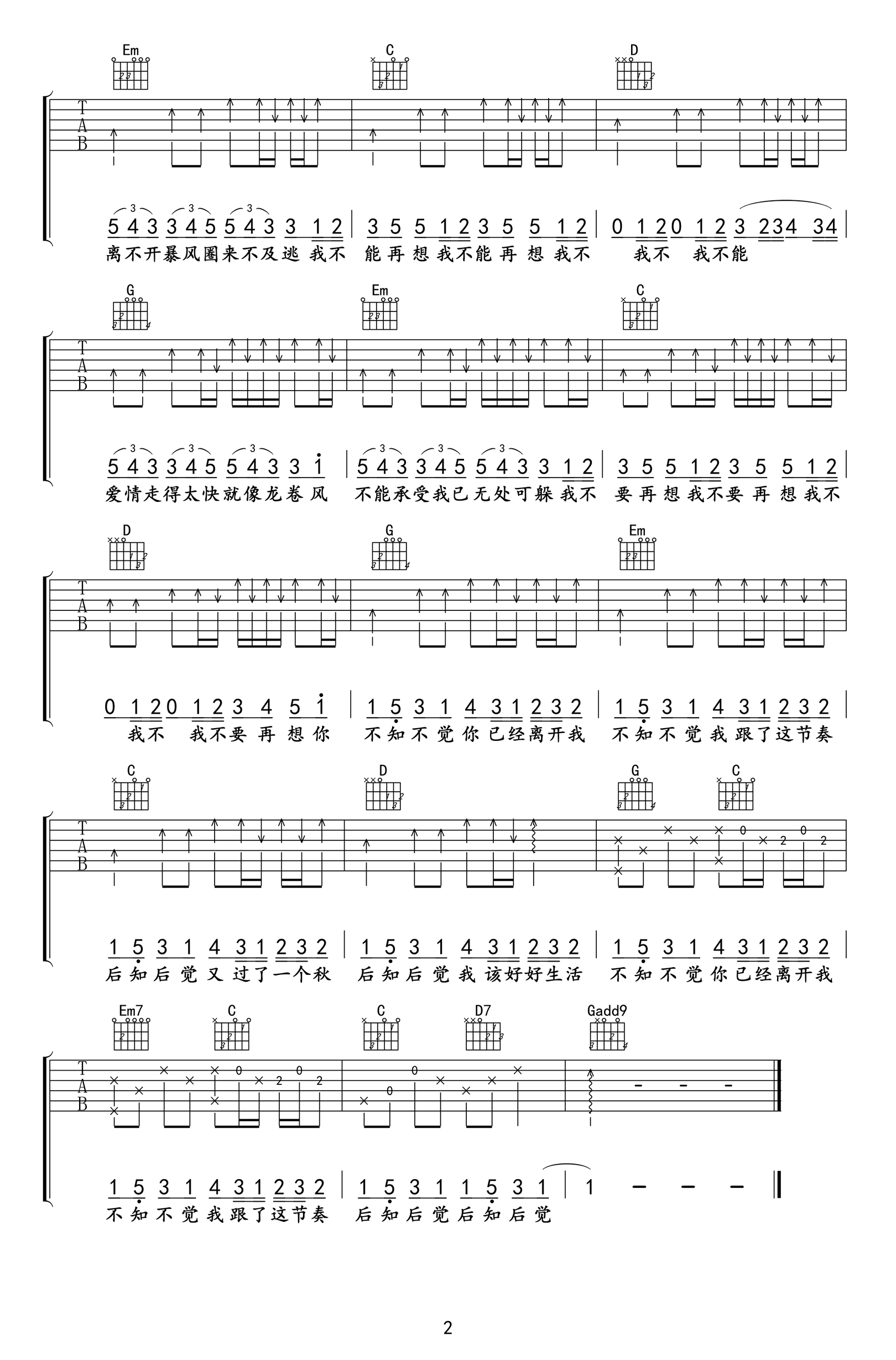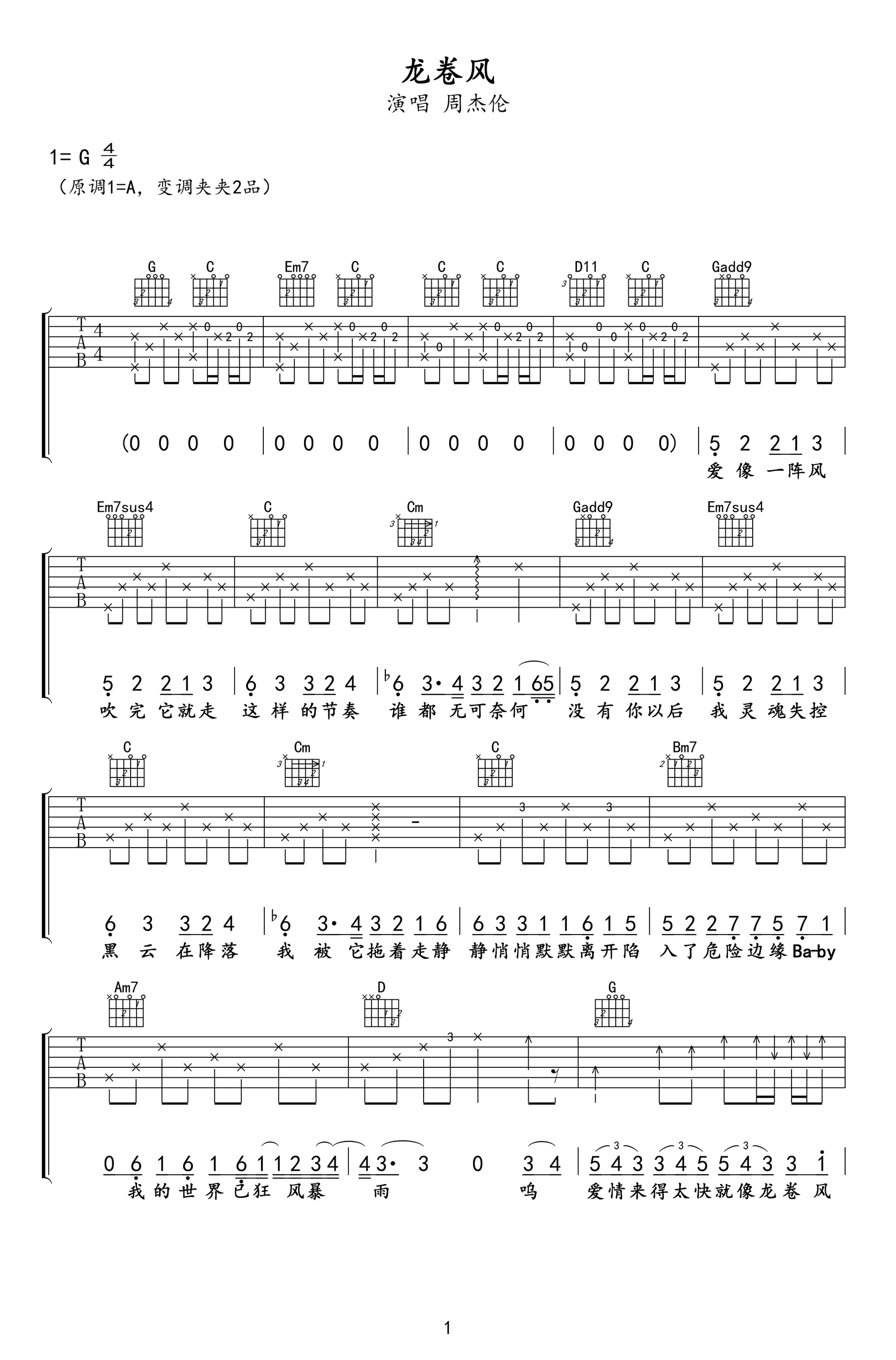 曲谱介绍: 龙卷风吉他谱,原调A选调G,变调夹夹二品。《龙卷风》吉他弹唱谱,两张高清图片六线谱。