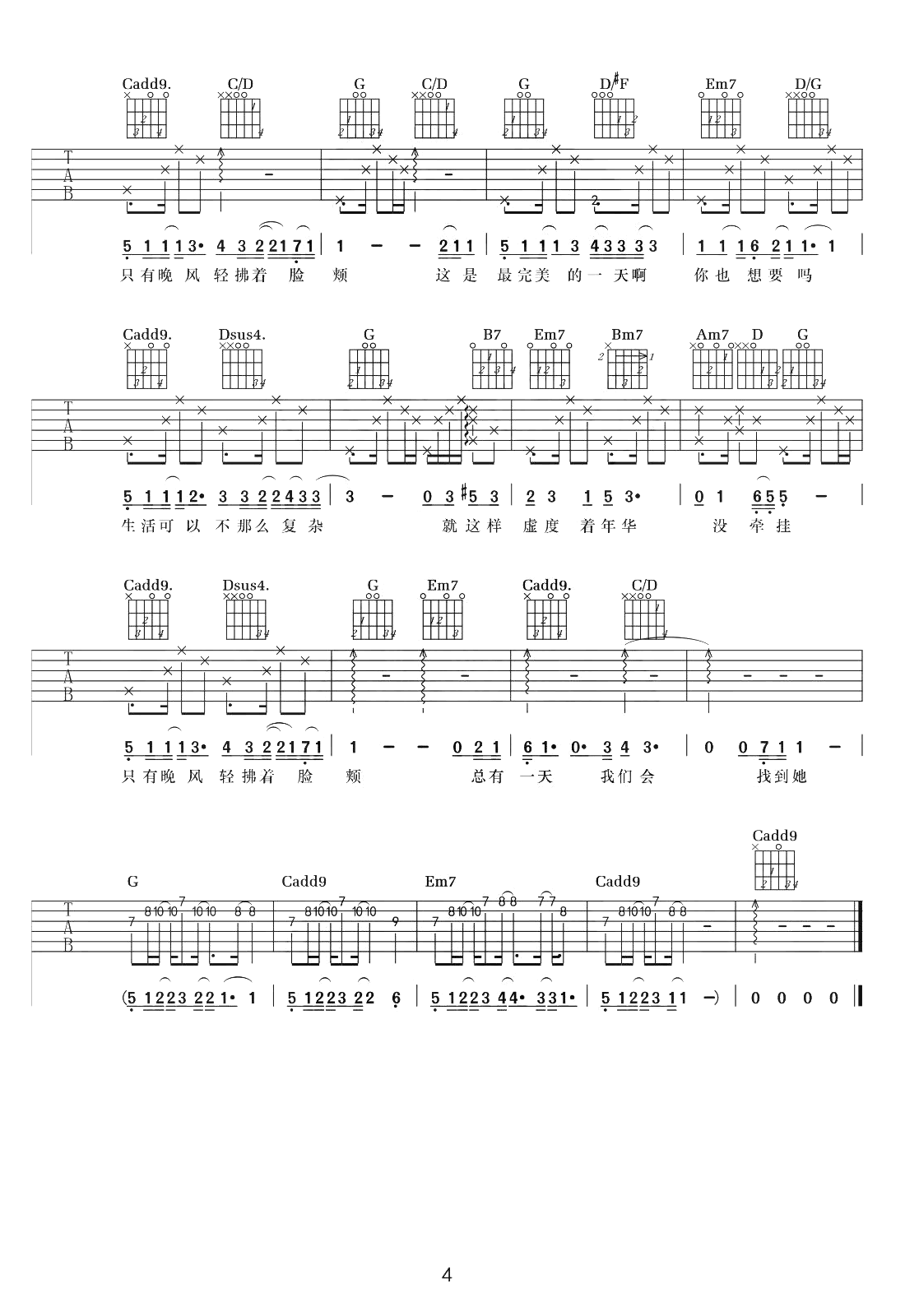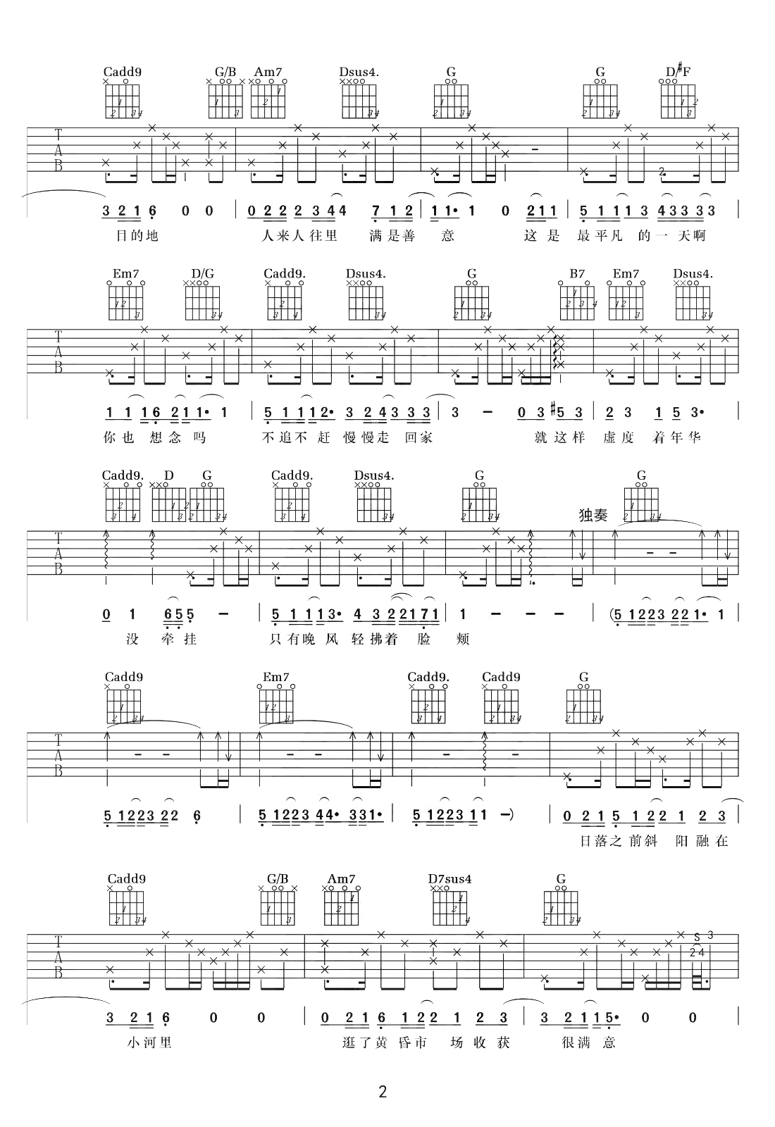 曲谱介绍: 毛不易一首伴奏以吉他为主的歌,《向往的生活》第三季主题曲,平凡的一天吉他谱,原调bG,选用G调指法,降半音调弦。《平凡的一天》吉他弹唱六线谱,完整版共四张图片谱例。