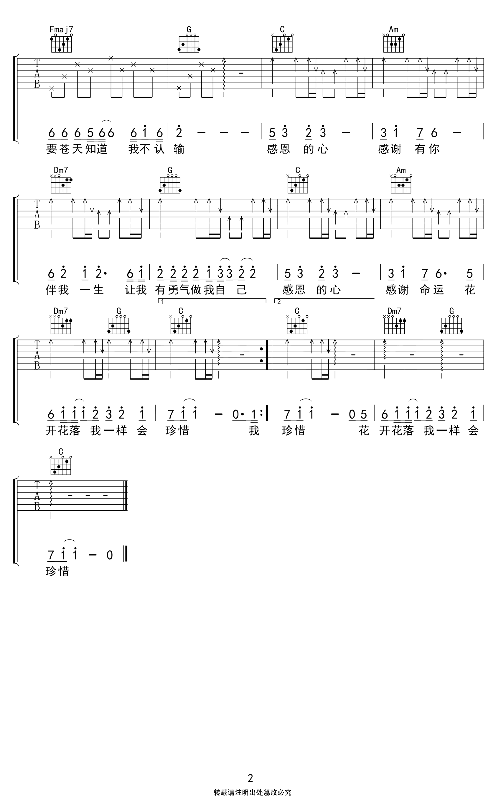 曲谱介绍: 欧阳菲菲的一首经典老歌,让无数人落泪,感谢生活中所有的遇见。感恩的心吉他谱,原调F选调C,变调夹第五品,《感恩的心》吉他弹唱谱,两张高清图片六线谱。