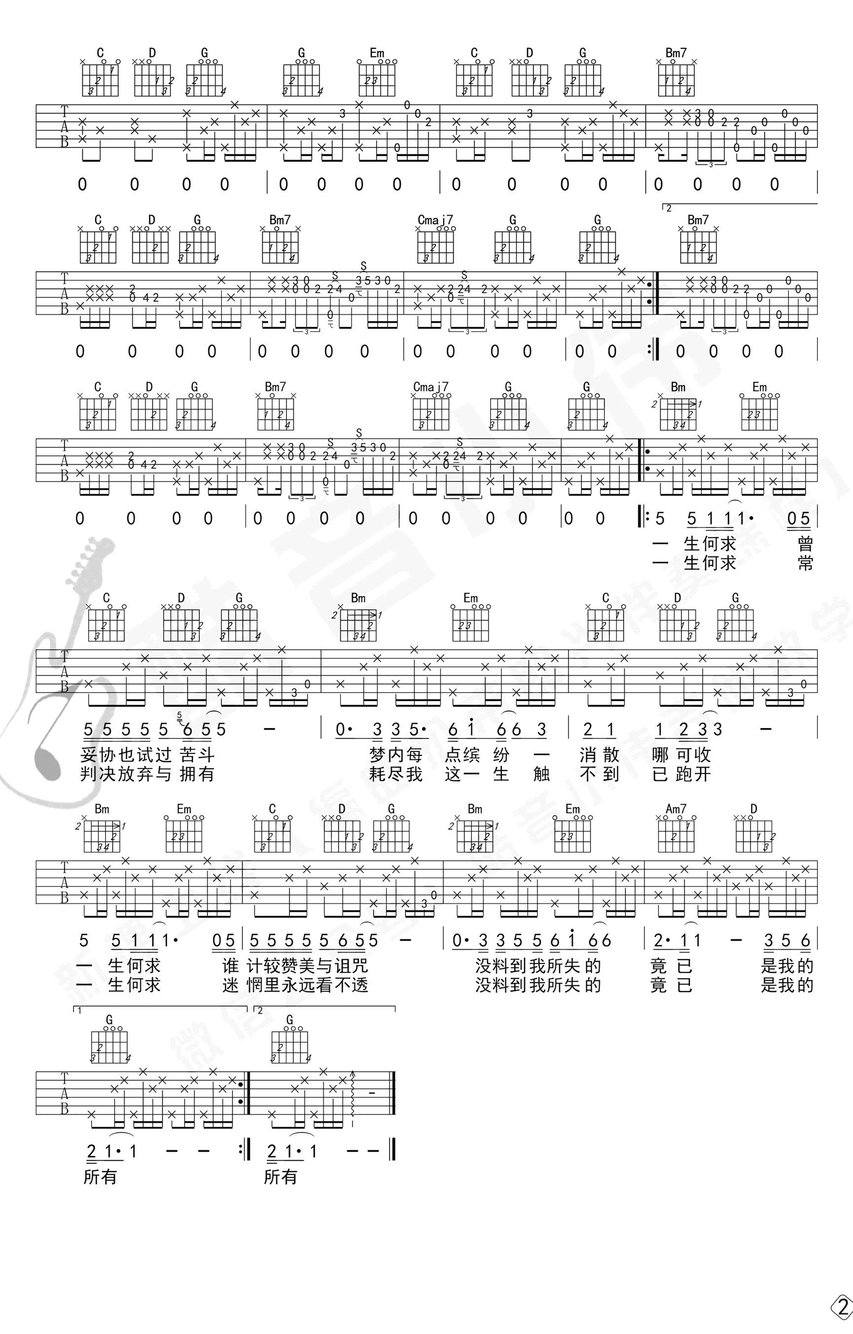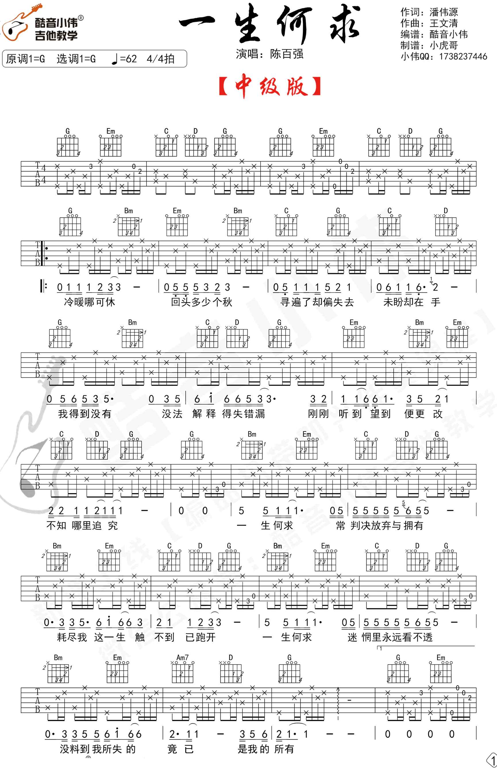 曲谱介绍: 陈百强的经典粤语歌曲,一生何求吉他谱,选用原调G调指法编配,四四拍节奏,男生可以不用变调夹,两张高清图片谱。附上《一生何求》吉他弹唱教学视频,琴友们跟随小伟老师的讲解示范,分分段落小节一步步练习。