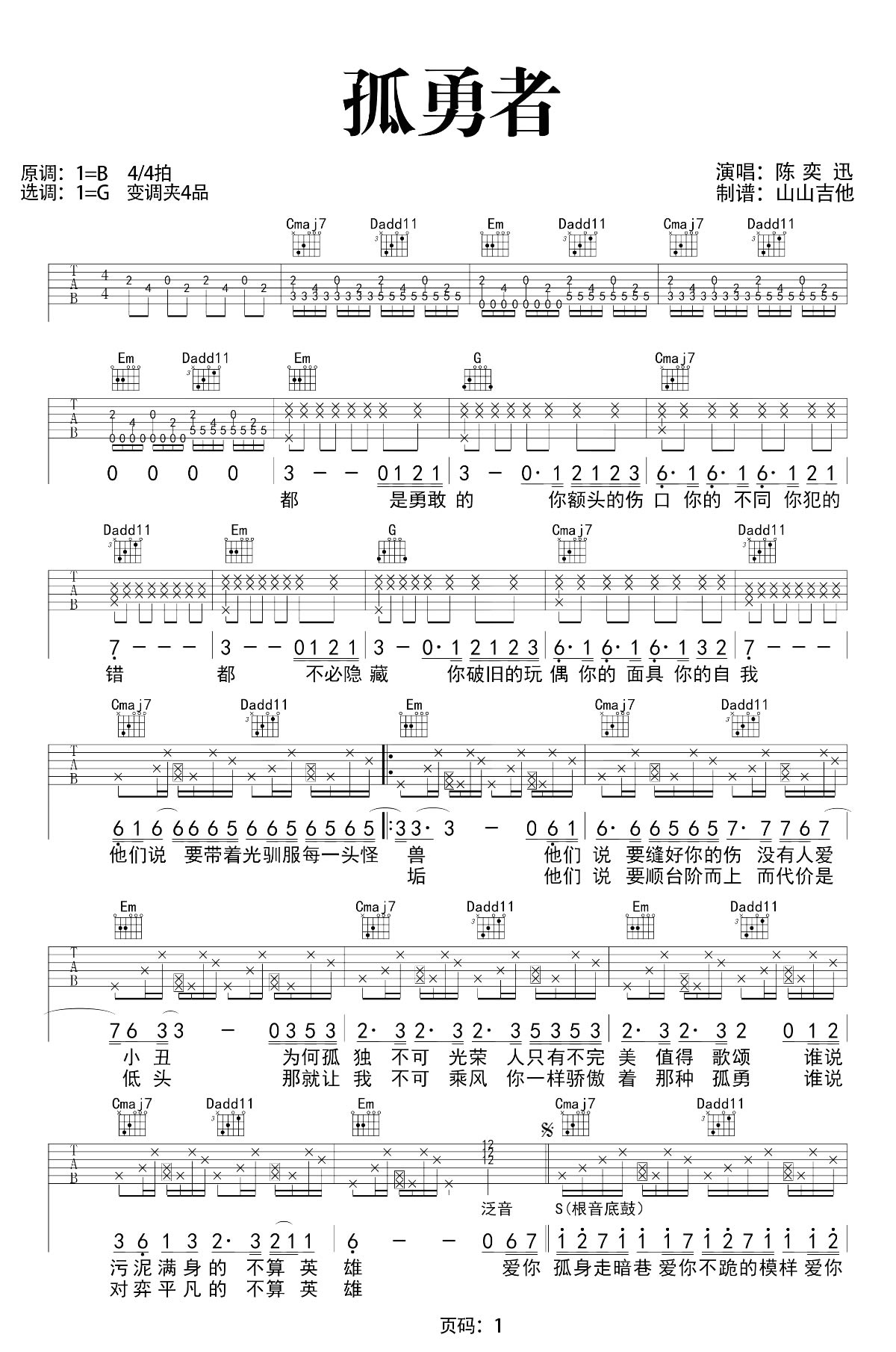 曲谱介绍: 陈奕迅演唱,《英雄联盟:双城之战》的宣传曲,孤勇者吉他谱,原调B选调G,变调夹四品,两张图片六线谱。《孤勇者》吉他弹唱演示和教学视频,山山老师提供示范讲解,琴友们参照练习。