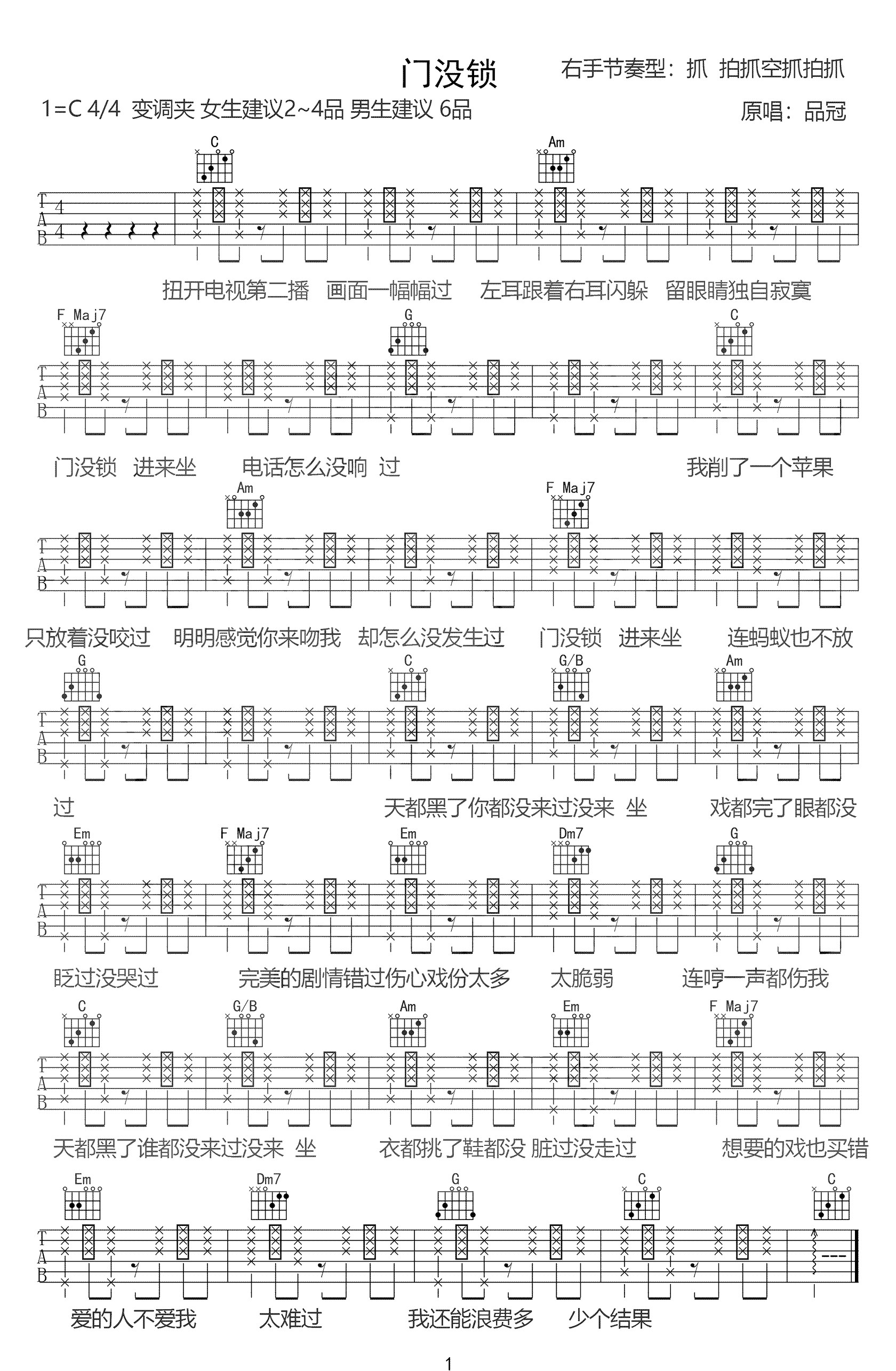 曲谱介绍: 门没锁吉他谱,品冠的一首老歌,最近因其儿子的翻唱而意外走红网络。《门没锁》吉他弹唱谱,为方便琴友们弹唱,提供两个调式编配版本,G调适合男生,有横按,如果你想唱品冠的原调,弹这个谱子,变调夹夹1品即可。C调男女通用,没有横按,相对简单一点,女生变调夹夹在2到4品都可以,男声建议夹6品。
