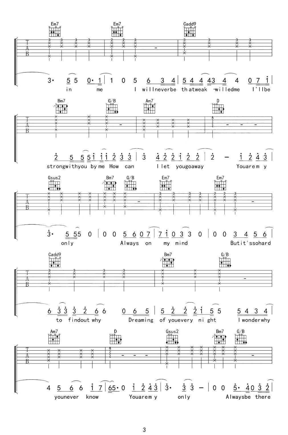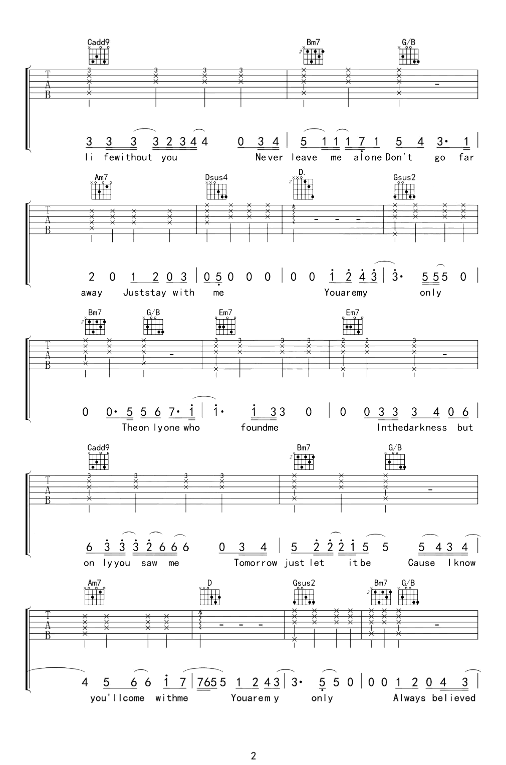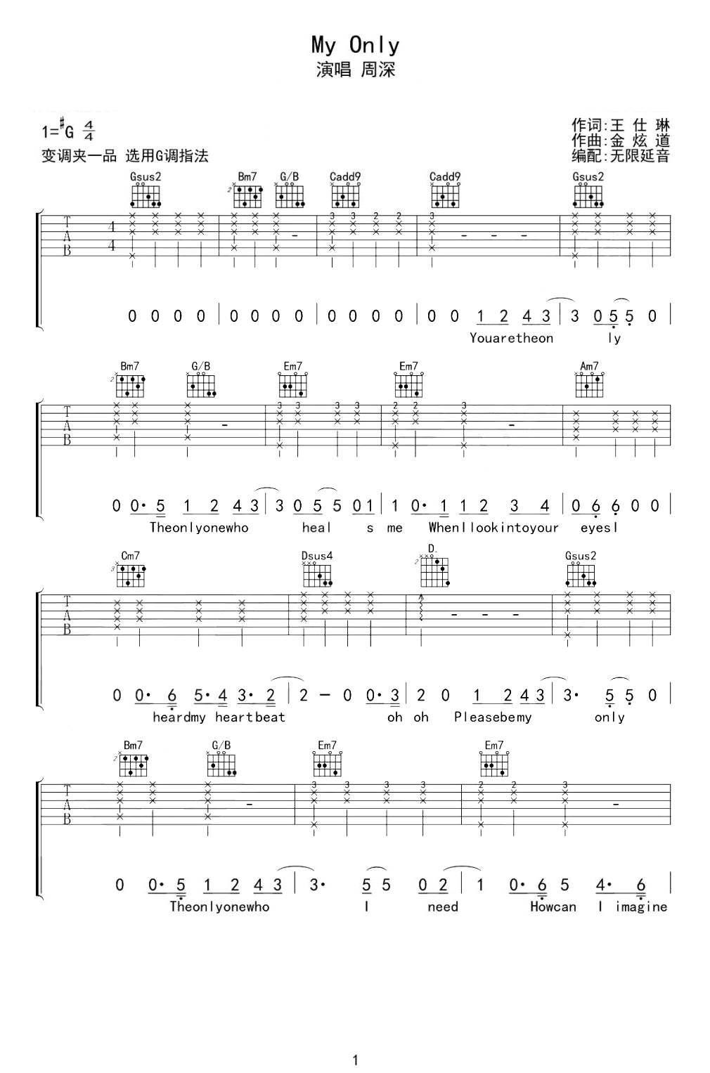 曲谱介绍: My Only吉他谱,周深献唱《开端》片尾主题曲,深情诉说时间循环中的浪漫与温暖。《My Only》吉他弹唱谱,原调升G,选用G调指法编配,变调夹一品。共四张图片六线谱。