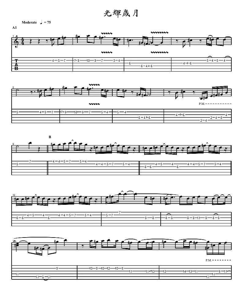 曲谱介绍: Beyond的粤语经典歌曲改编,《光辉岁月》吉他谱solo完整版,两张图片谱例。附上曲谱同步伴奏演示视频,光辉岁月完美solo,音色干净好听!
