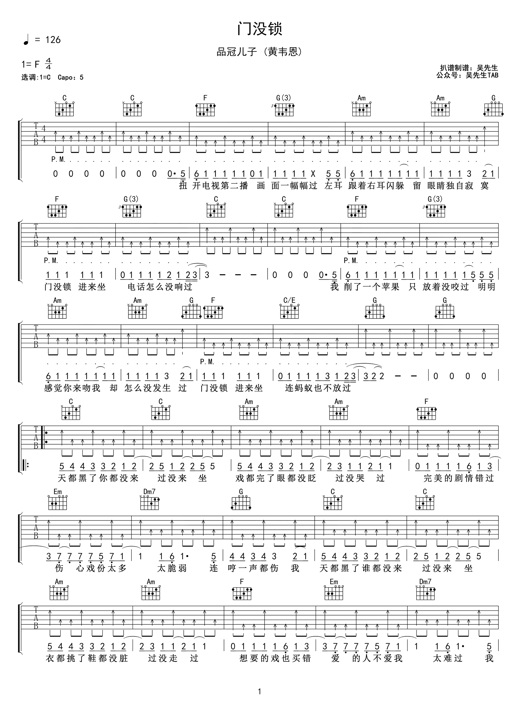门没锁吉他谱 - 品冠儿子(黄韦恩) - C调吉他弹唱谱