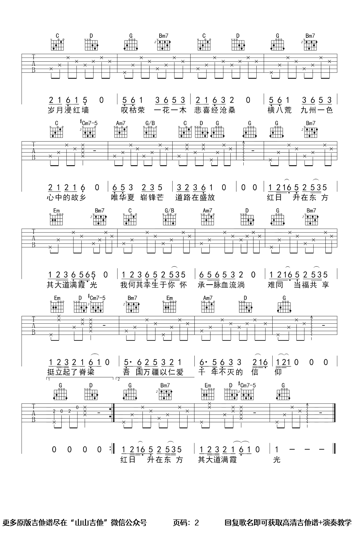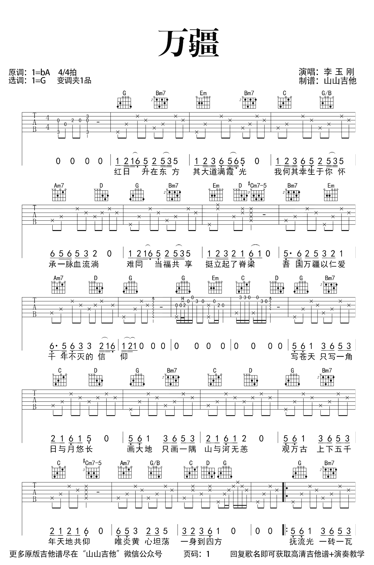 曲谱介绍: 李玉刚一首唱尽中华儿女家国情怀的国风歌曲,万疆吉他谱,原调降A选调G,变调夹夹一品,两张图片六线谱。《万疆》吉他弹唱演示教学视频,同学们参照山山老师的示范讲解练习。