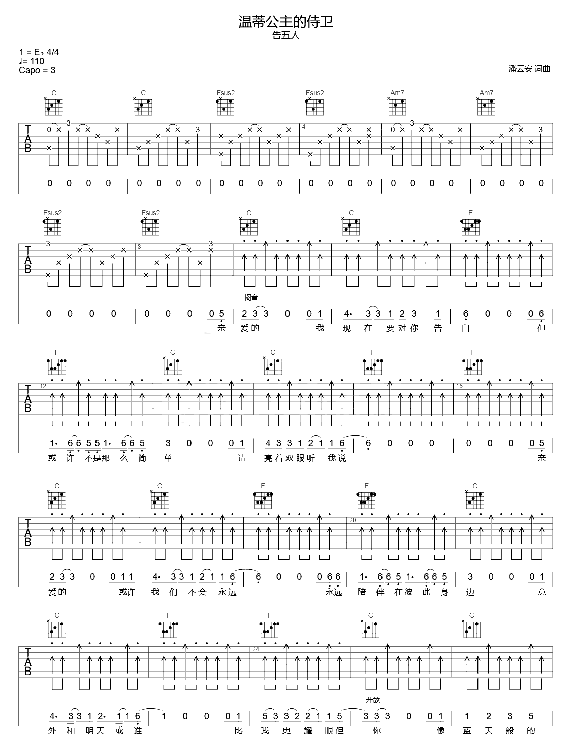 曲谱介绍: 告五人/杨紫《温蒂公主的侍卫》吉他弹唱谱,共有3张高清图谱。