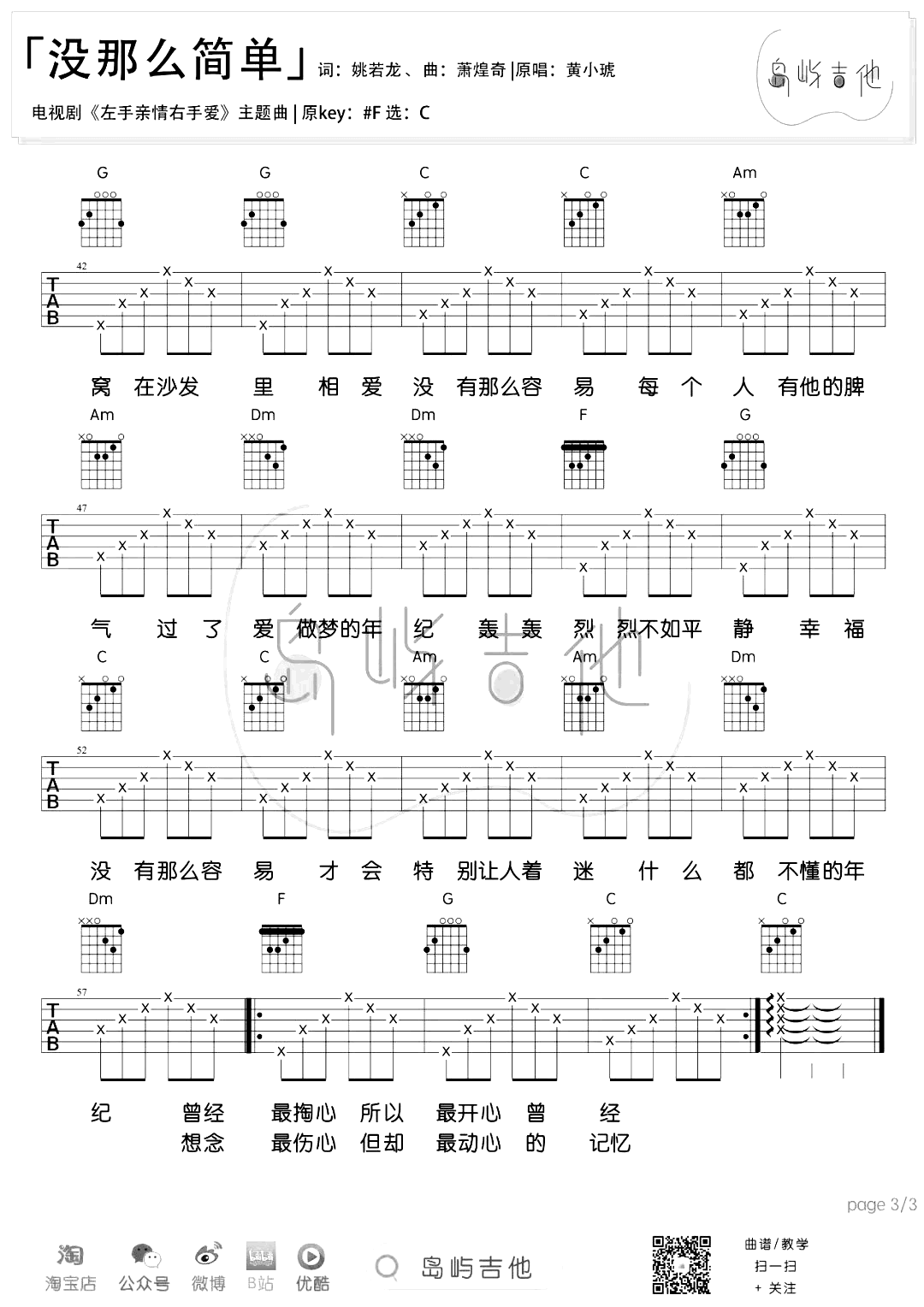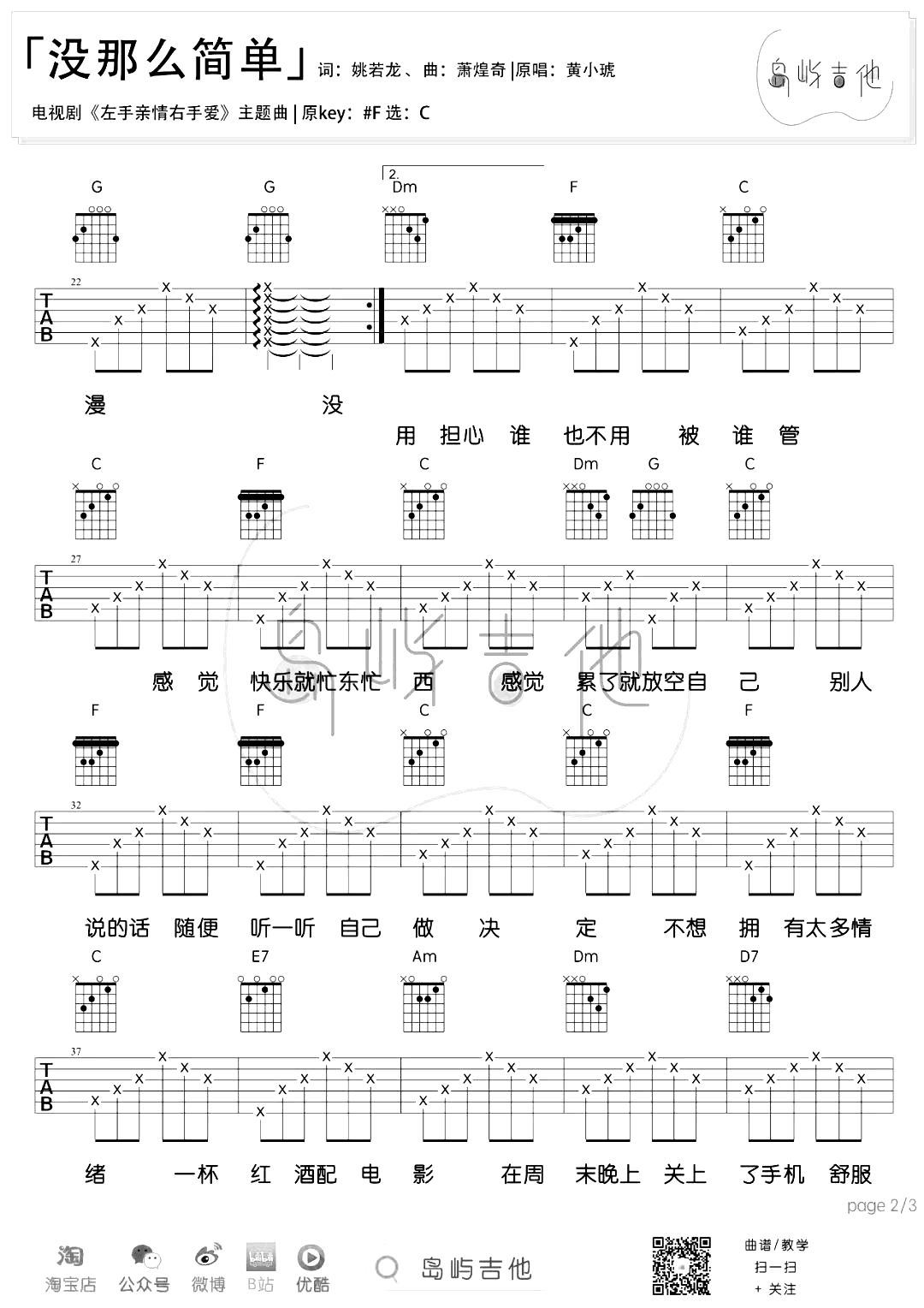 曲谱介绍: 没那么简单吉他谱,黄小琥的一首经典情歌,句句唱进人心,一下子唱出了许多单身人士的心声。《没那么简单》吉他弹唱谱,原调升F,选调C,三张图片六线谱。
