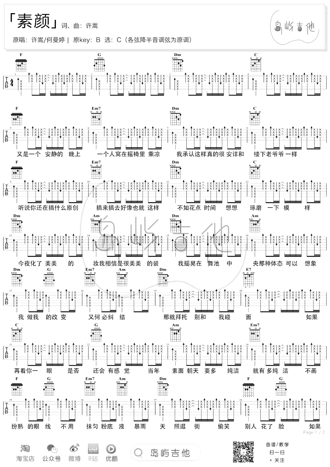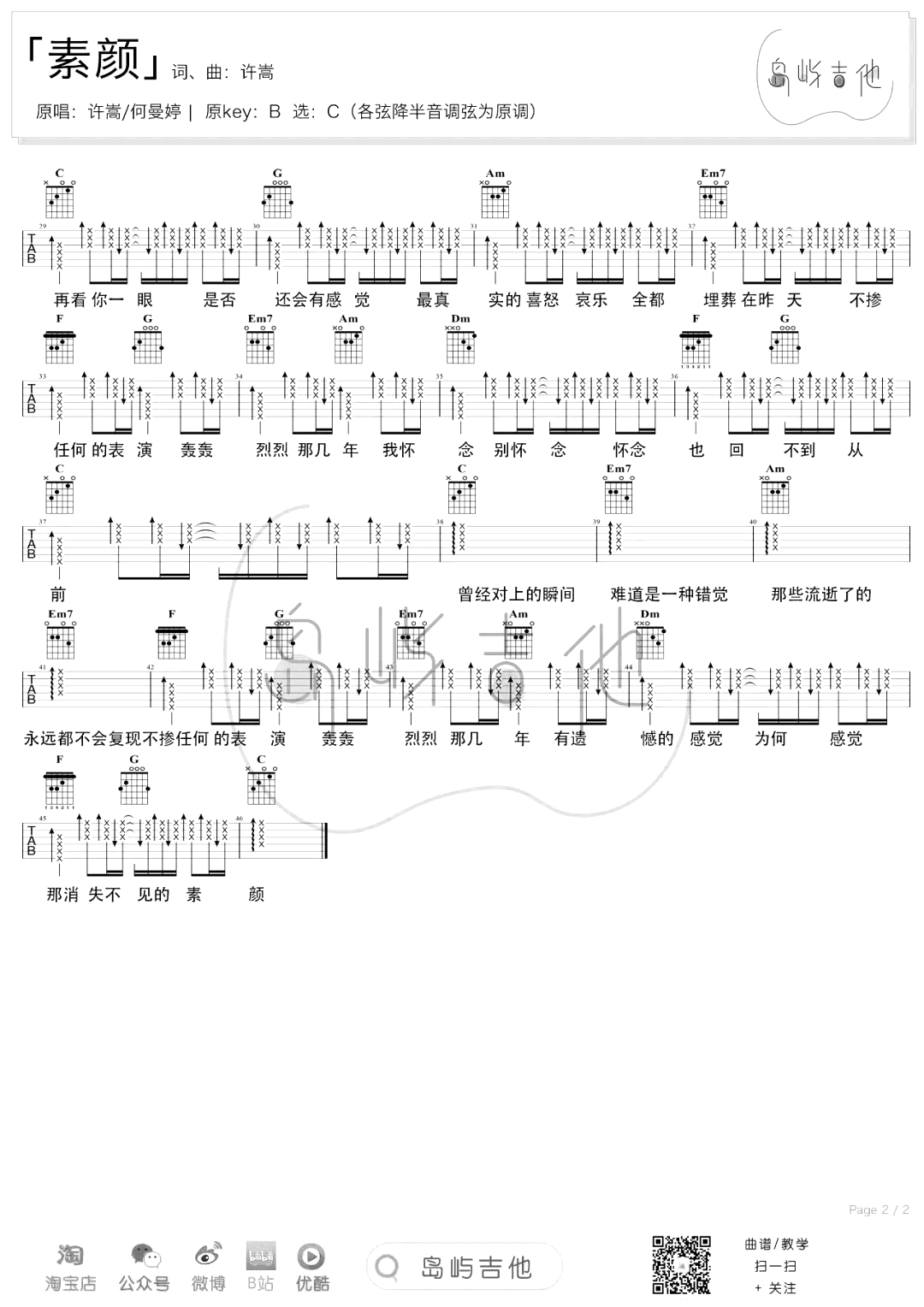 素颜吉他谱 - 许嵩/何曼婷 - C调吉他弹唱谱