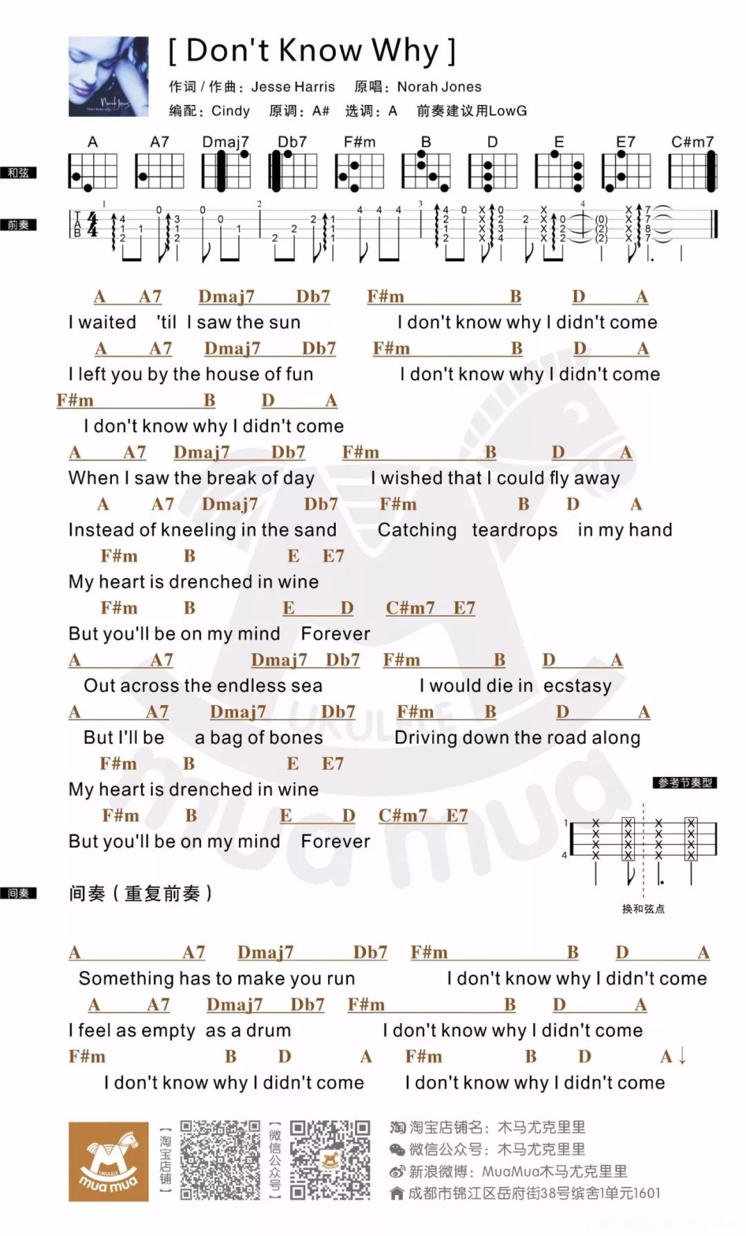 曲谱介绍: 按理说,一张在格莱美斩获至少5项大奖的专辑,其中最经典的代表作是不应该被放在“木马小众时间”里分享的。 但现在听过这首2002年爵士经典的人确实不多了。 Norah Jones-《Don't Know Why》 这首歌当年在乐坛有什么地位呢? 《Don't Know Why》收录于诺拉·琼斯2002年的专辑《Come Away with Me》(远走高飞)中,该专辑获得第45届格莱美音乐奖的年度最佳唱片、最佳新人以及年度最佳专辑在内的五项大奖; 可能是让中国乐迷比较普遍接触到爵士的第一张专辑,也是很多人开始听爵士乐的契机,可以说是小编对爵士感兴趣的入门专辑; 《Don't Know Why》是Norah Jones的经典爵士乐代表作品,获得第45届格莱美的年度最佳单曲,在爵士乐发展进程中具有标志性的一首歌, 已被收纳到美国高中音乐课程必修。 这并不是一张传统意义上的爵士专辑,它游离于各种风格之间,诞生了新的爵士风格,因此一批老的爵士乐手/歌手不认可这种新的爵士,在她出道之初也曾经引起了音乐界和评论界对于她的独特风格的诸多争论。   视频演示 这首歌,不难 旋律明确,朗朗上口 可算是最好入门的爵士歌曲了 原调需要变调夹夹一品哦! 最重要的:前奏需要使用LowG弦!   尤克里里谱