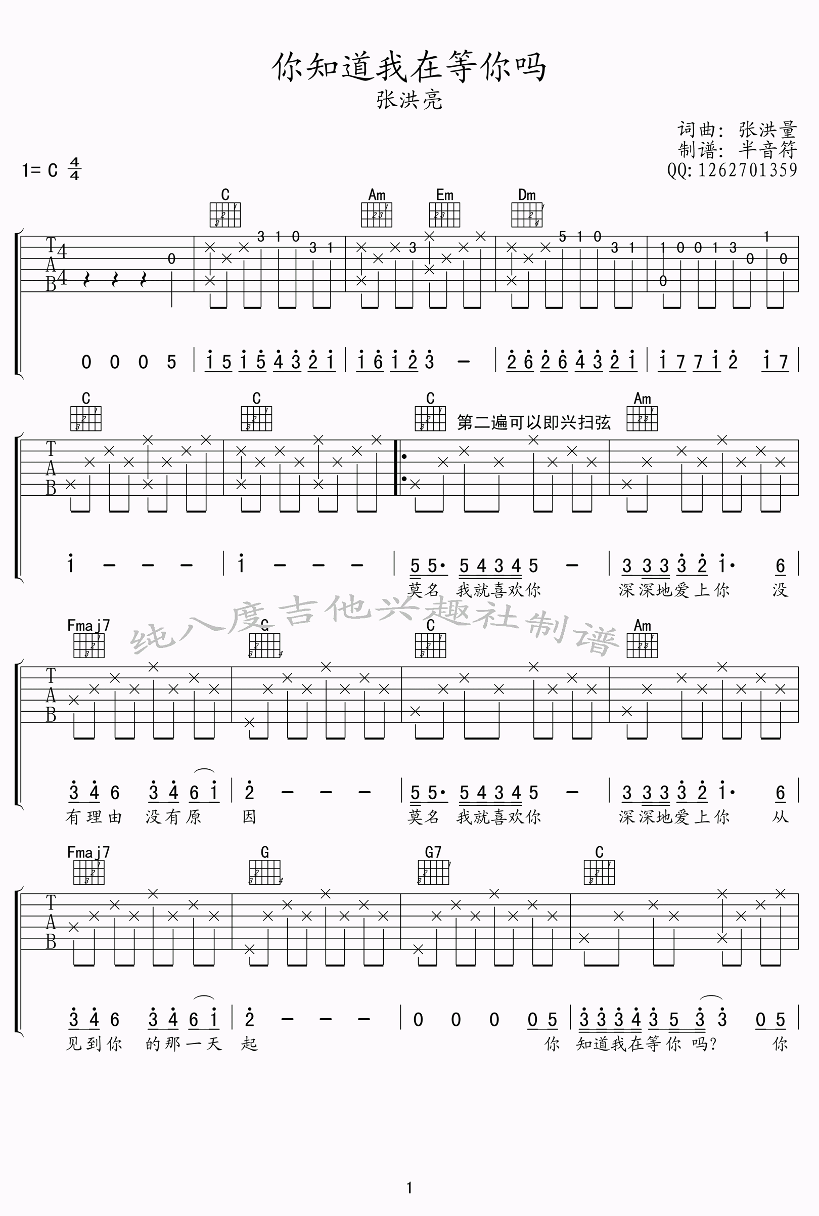 你知道我在等你吗吉他谱 - 张洪量 - C调吉他弹唱谱