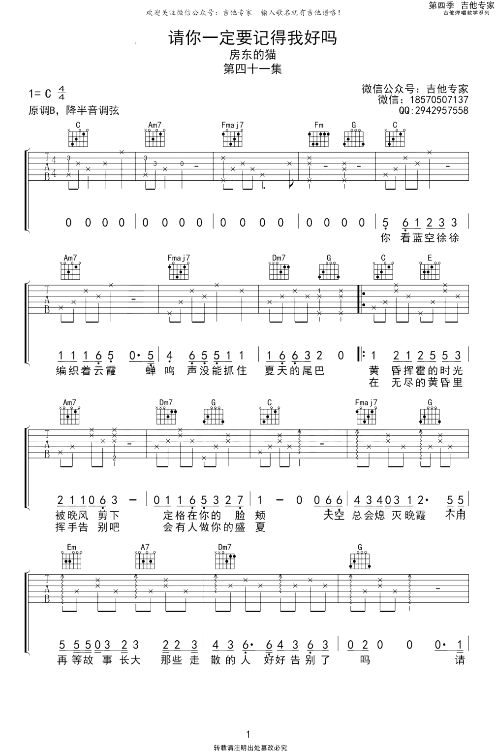 曲谱介绍: 房东的猫演唱一首浪漫又心酸的歌曲,那些走散的人,好好告别了吗?请你一定要记得我好吗吉他谱,原调B选调C,降半音调弦,《请你一定要记得我好吗》吉他弹唱六线谱,两张图片谱。