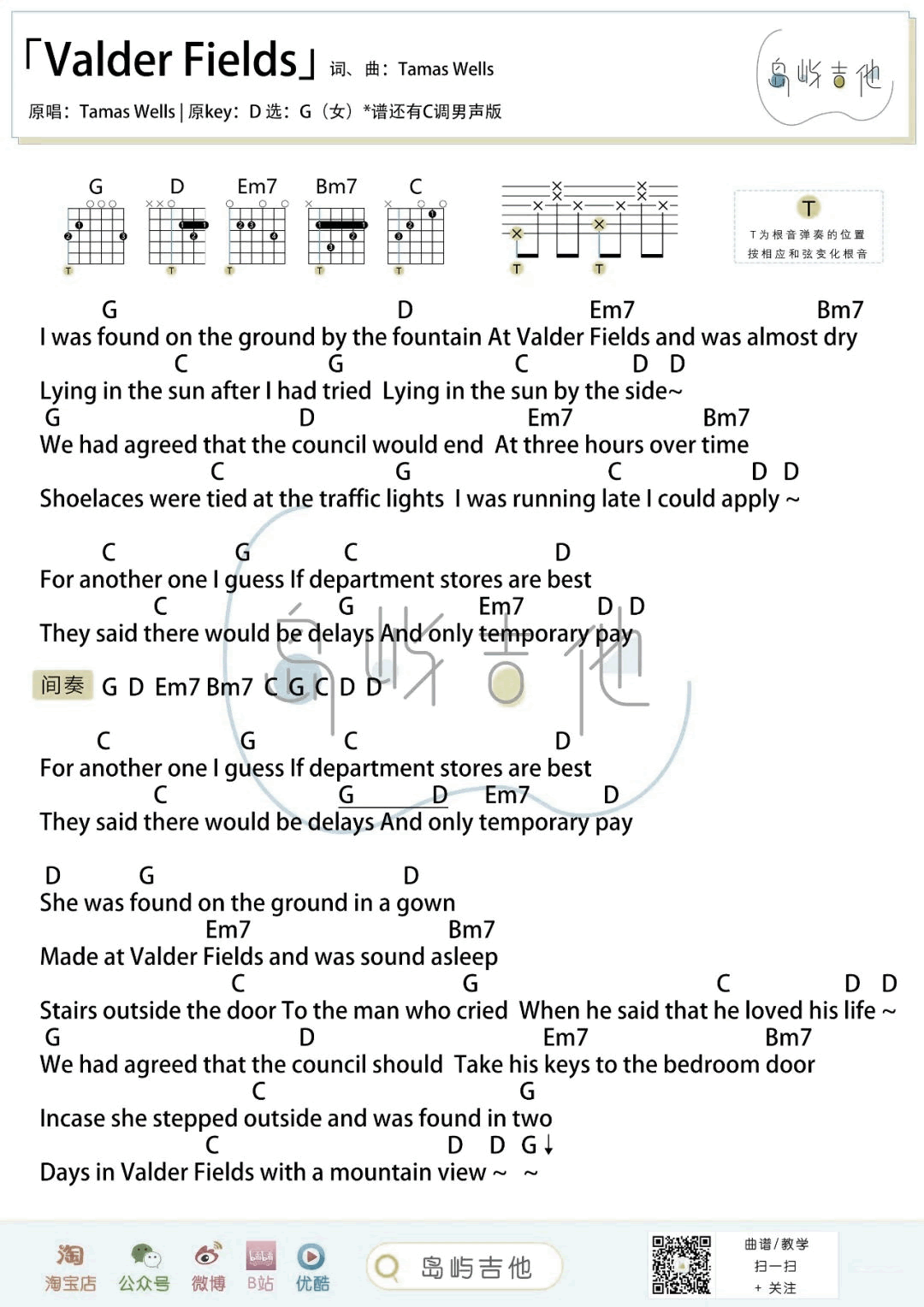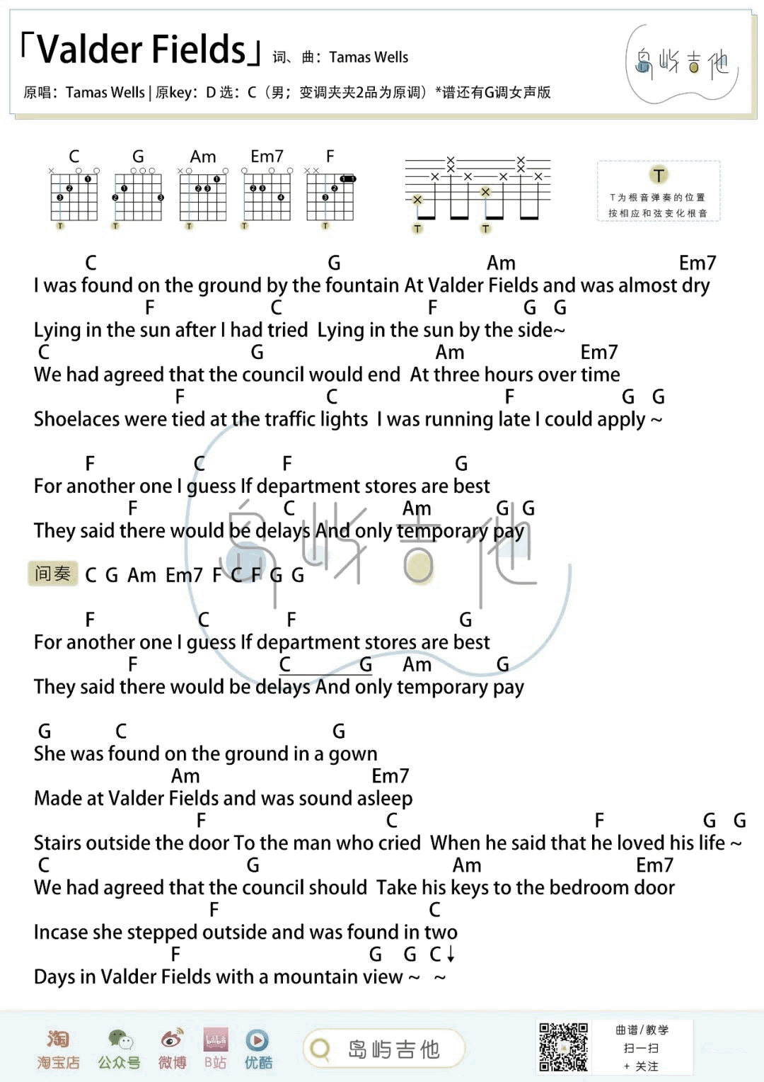曲谱介绍: Valder Fields吉他谱,Tamas Wells演唱的一首经典英文歌曲,《Valder Fields》吉他弹唱谱,为琴友们送上G调女生版和C调男生版两个调式编配,和弦弹唱图片谱。