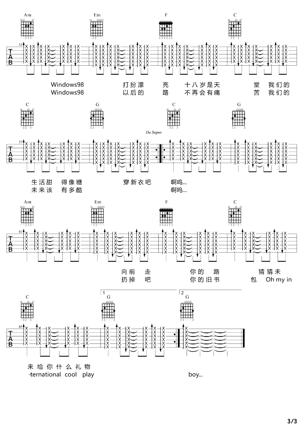 曲谱介绍: New Boy吉他谱,朴树演唱的一首经典老歌,希望这首简单的歌带给你快乐,曲谱变调夹参考,男夹2品,女夹5品。要说什么难点,那当然就是F和弦了,附上《New Boy》吉他弹唱演示和教学视频,老师讲解了陌生和弦的练习方法,还有高效练习和弦转换的方法,希望可以帮到你。用小指指法按G的时候,五弦也弹不响的情况,大拇指放琴颈背后不要伸出来,手腕往前推,手掌悬空,手指就会有更多的空间立起来。这样比较容易按响。