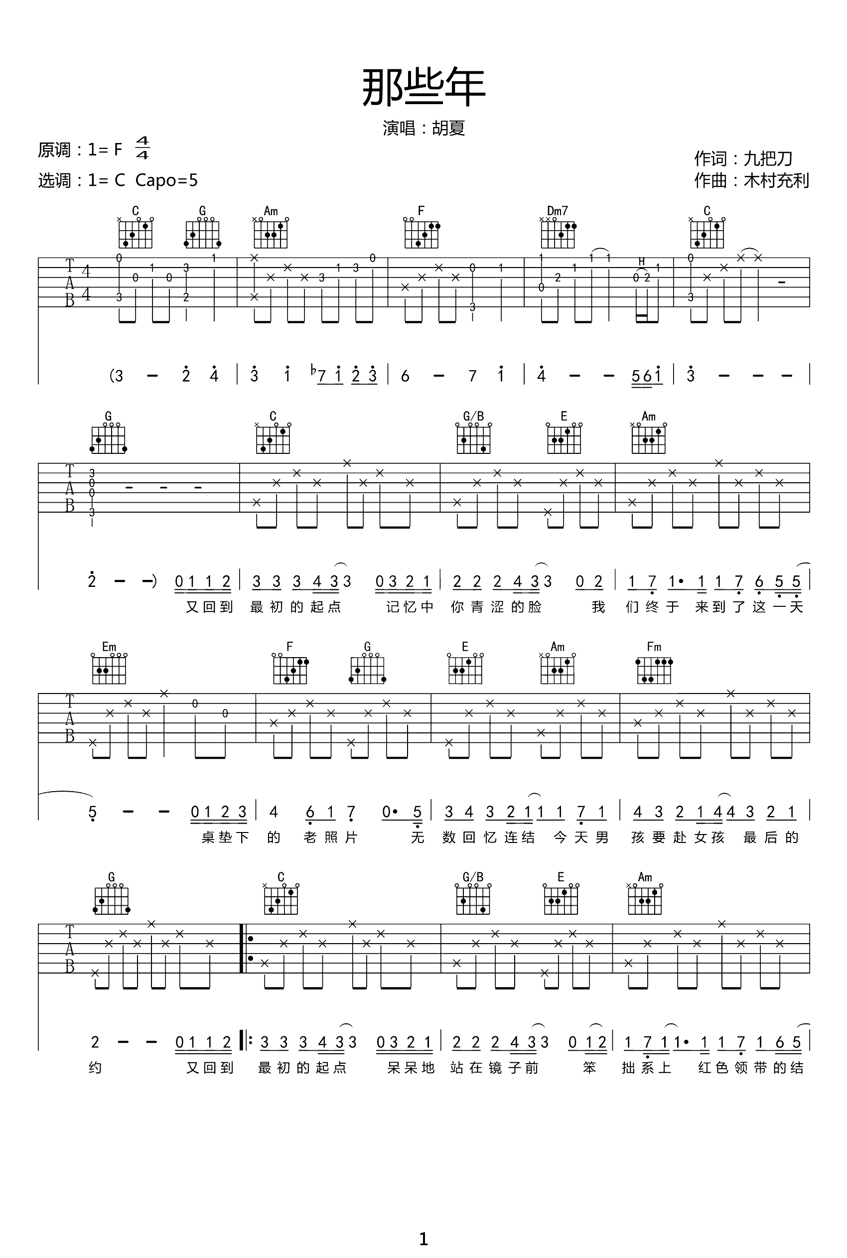 曲谱介绍: 那些年吉他谱,胡夏献唱《那些年我们一起追的女孩》主题曲。《那些年》吉他弹唱谱,三张高清图片六线谱,原调F选调C,CAPO夹五品。