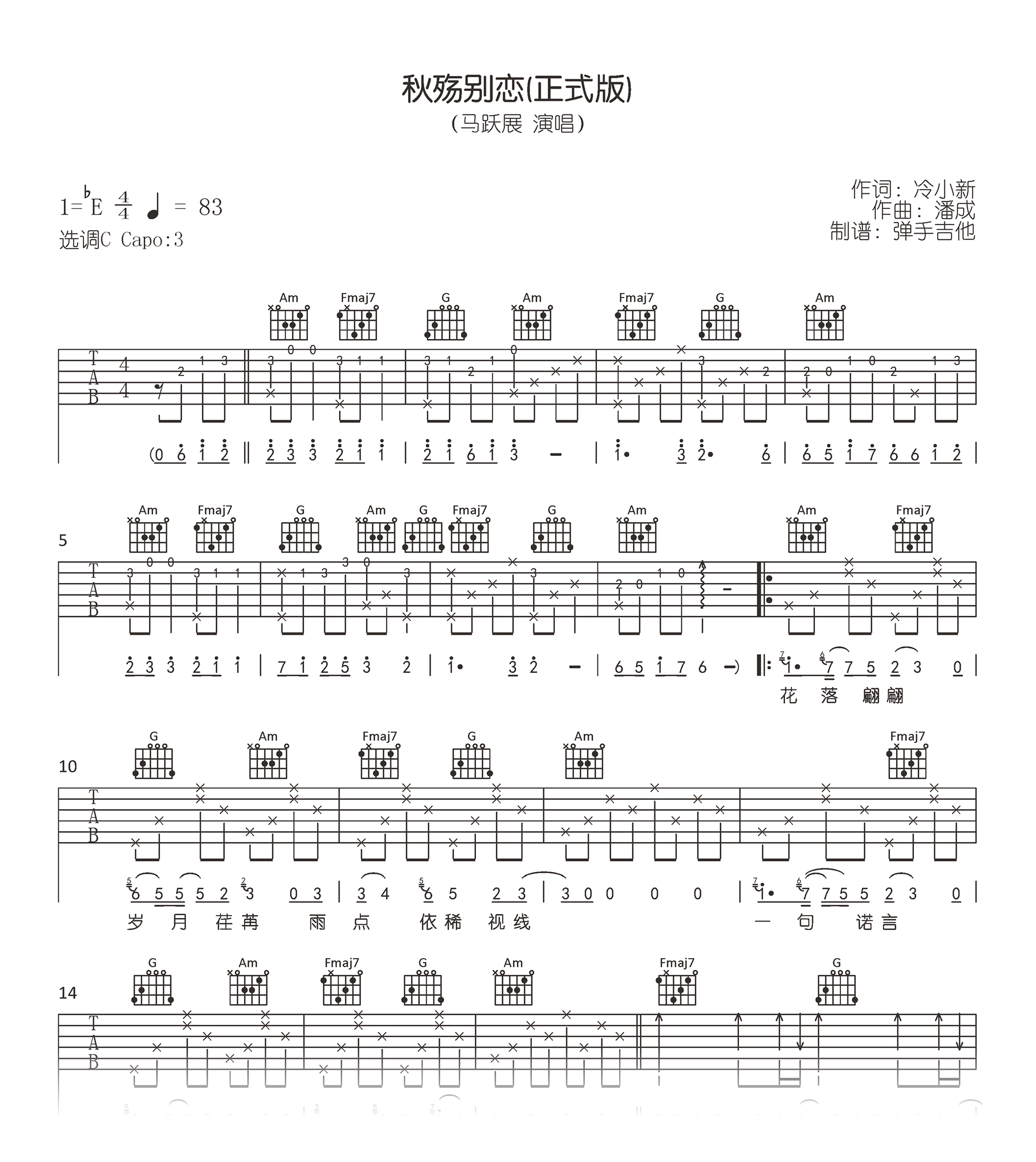 曲谱介绍: 秋殇别恋吉他谱,马跃展的翻唱版本,一首热门中国风歌曲,原调bE,选用C调指法,变调夹夹三品。《秋殇别恋》吉他弹唱谱,完整编配共三张高清图片六线谱。