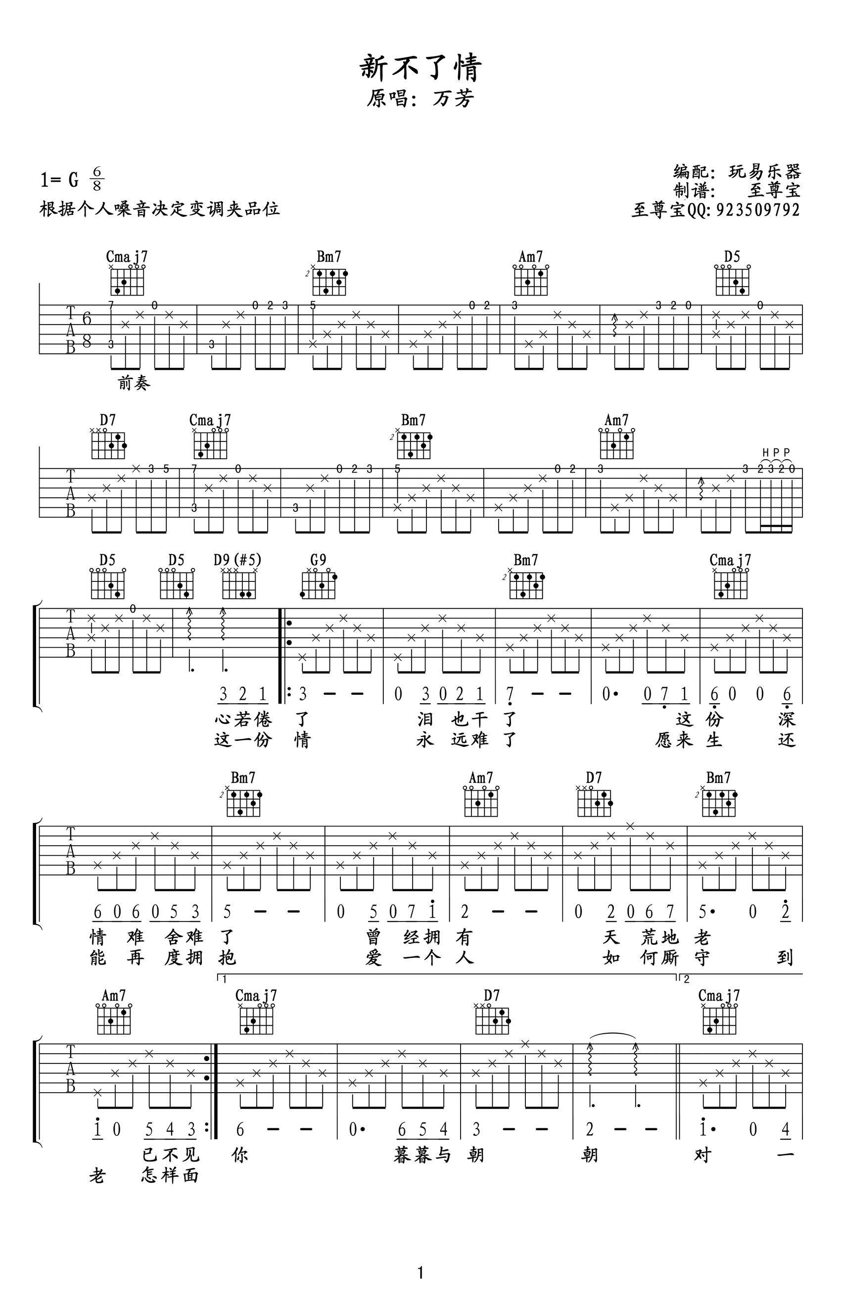曲谱介绍: 萧敬腾/万芳《新不了情》吉他弹唱谱,采用G调指法编配,共有2张高清图谱,免翻页排版设计。