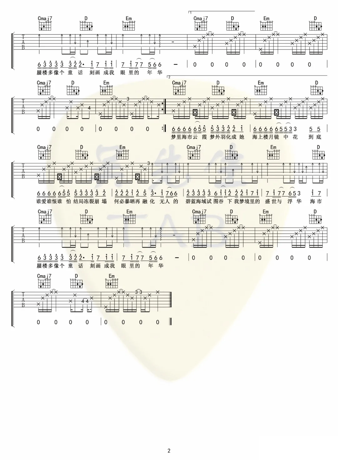 曲谱介绍: 三叔说《海市蜃楼》吉他弹唱谱,采用G调指法编配,共有2张高清图谱,免翻页排版设计。