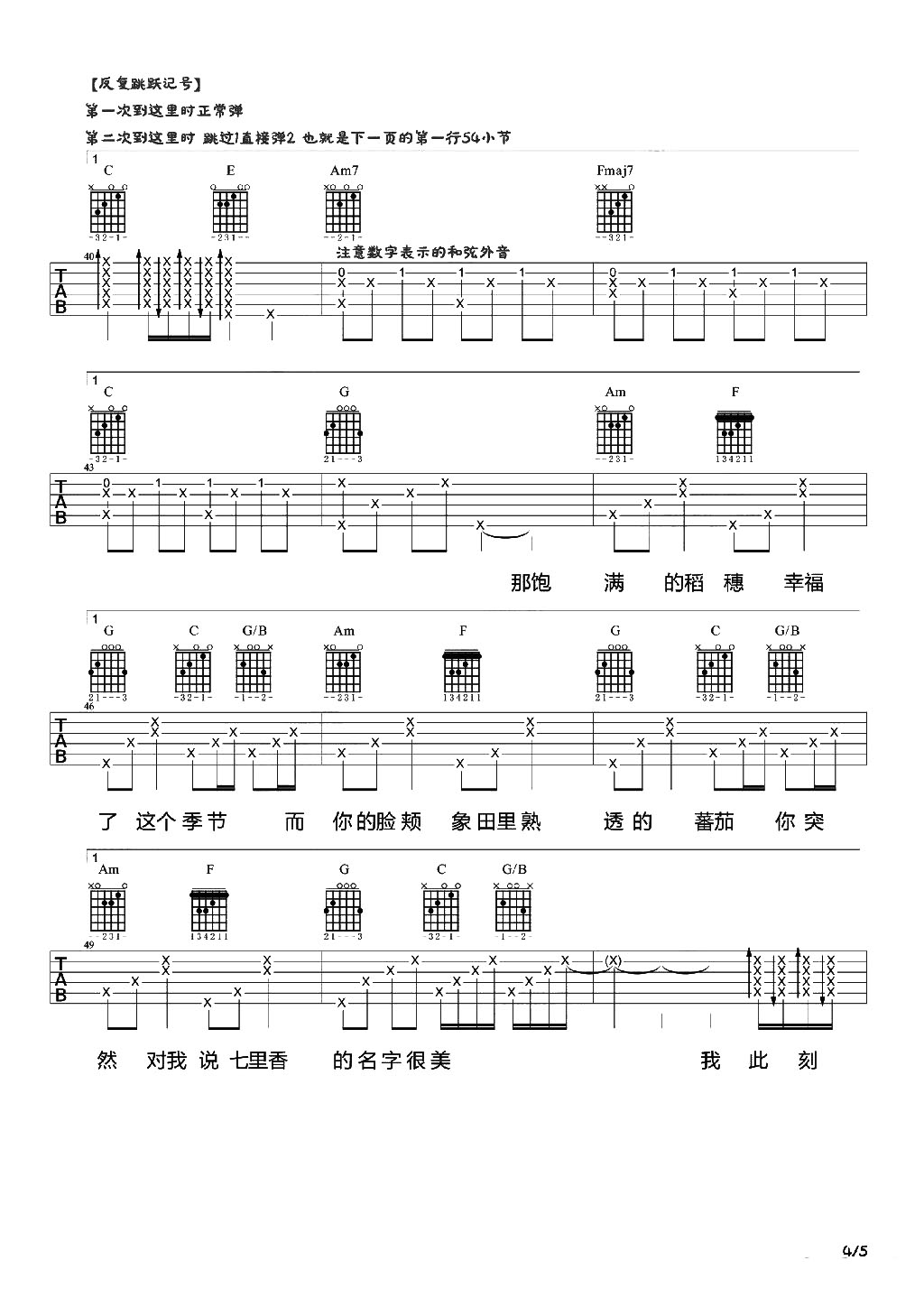 曲谱介绍: 周杰伦《七里香》吉他弹唱谱,共有5张高清图谱。
