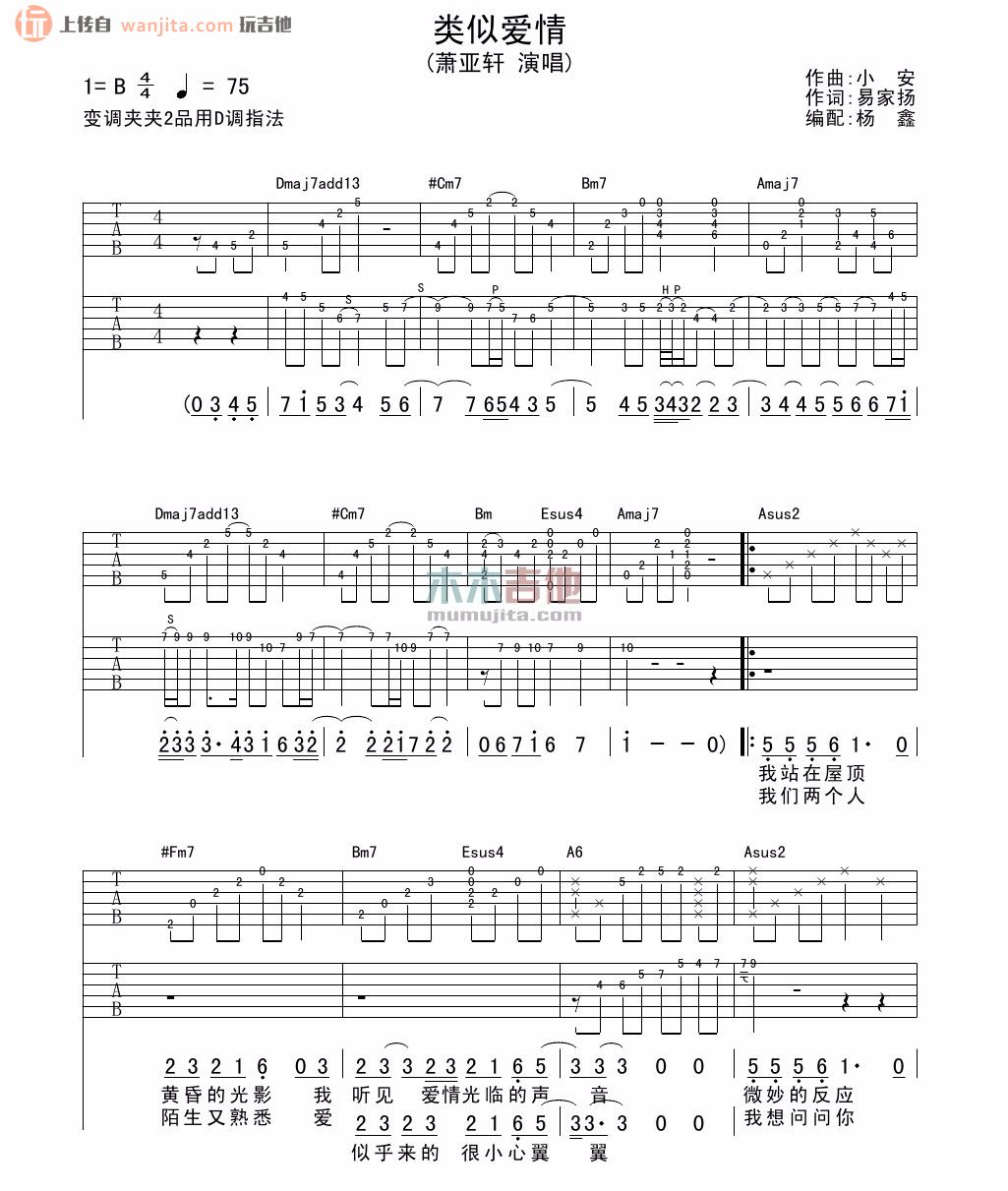 曲谱介绍: 《类似爱情》吉他谱B调,变调夹夹二品,用D调指法,由杨鑫编配。这首爱情伤感歌曲被吉他缓缓演绎,好像吉他会说话,它帮助我们营造气氛,帮助我们走入情绪。这版吉他谱不算难,适合大多数朋友学习。