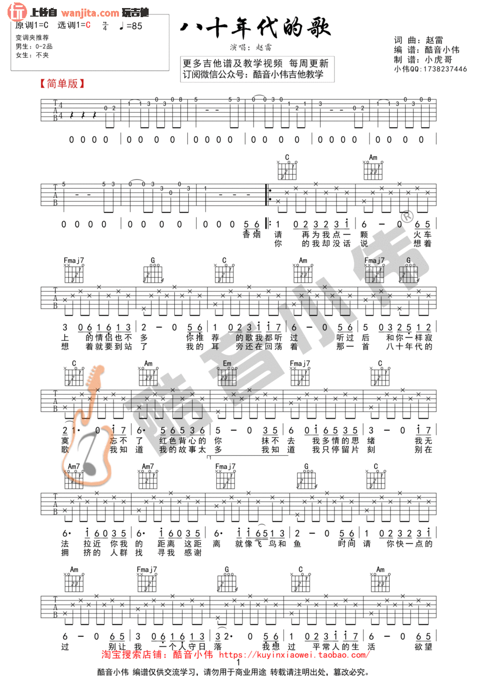 曲谱介绍: 《八十年代的歌》吉他谱原调C调,男生变调夹夹0到2品,女生不使用变调夹,小虎哥制谱。作为一首民谣歌曲,简单易学习是他的特点,这首歌延续了这一特点,适合广大爱好者学习的一张曲谱。