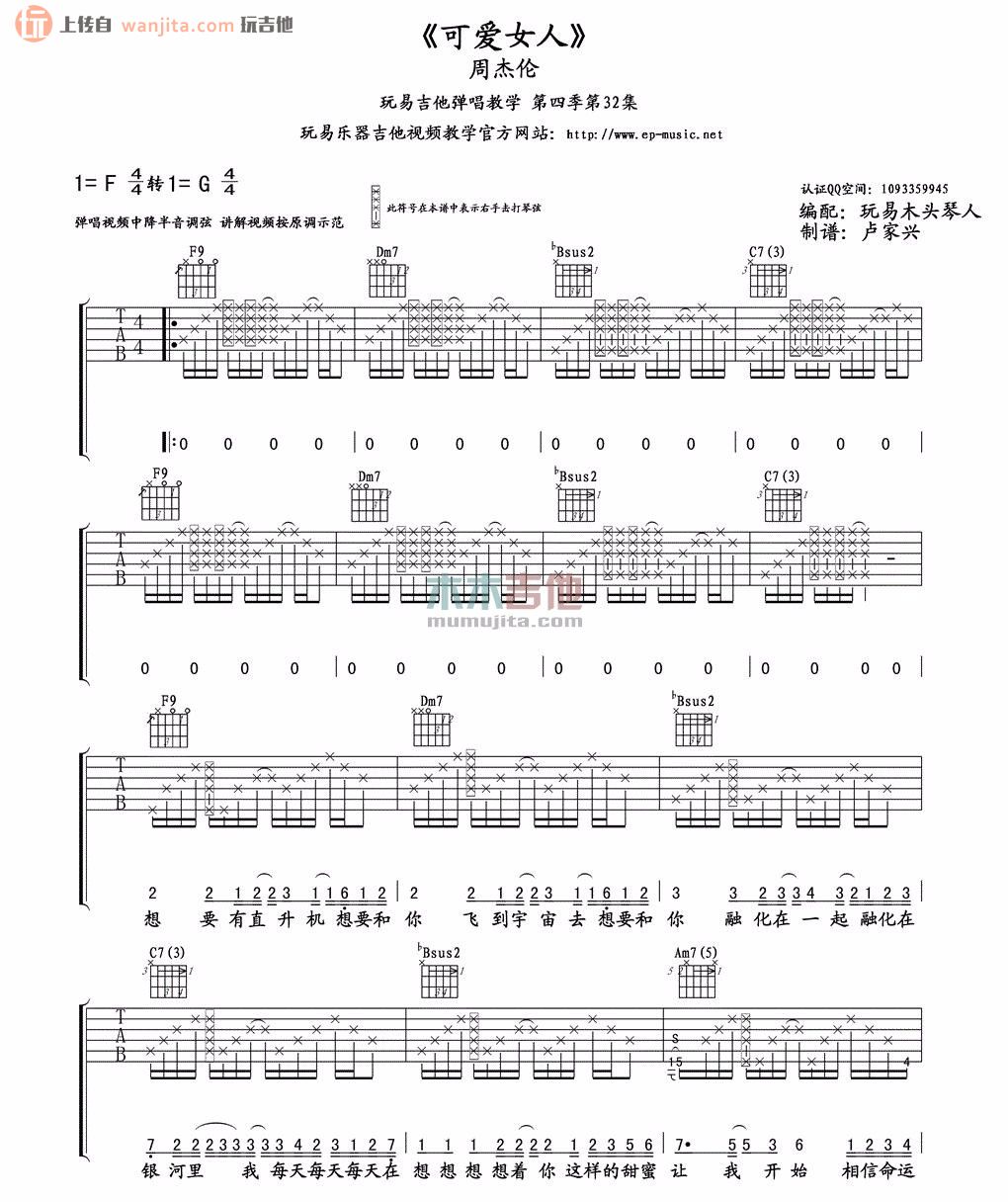 可爱女人吉他谱 - 周杰伦 - F调吉他弹唱谱 - 原版
