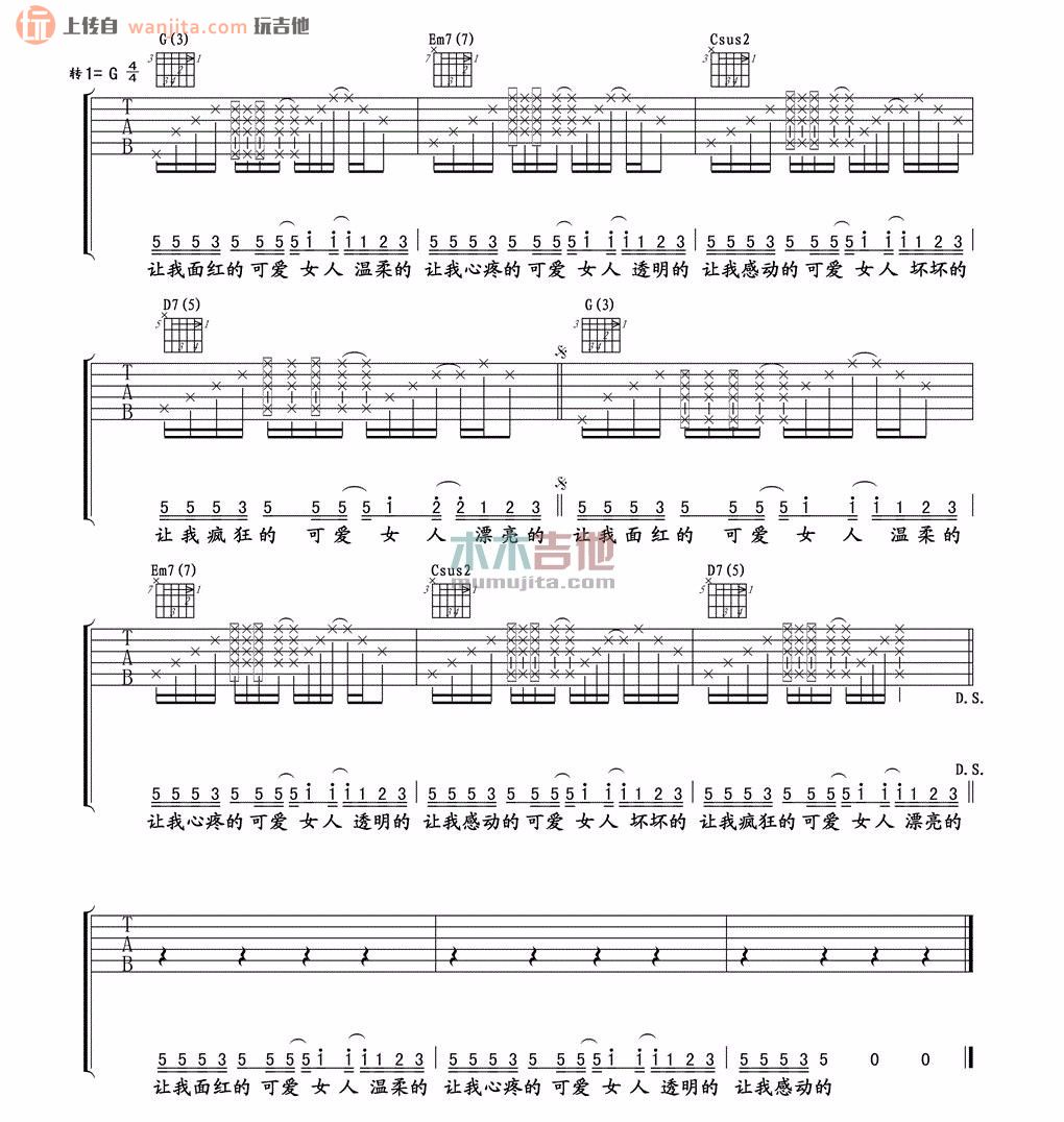 曲谱介绍: 《可爱女人》吉他谱F调转G调,不使用变调夹,卢家兴制谱。这首简单的爱情歌曲作为弹唱来说不难,勤加练习就可以。大家弹唱时要注意右手的节奏把控,多多练习。