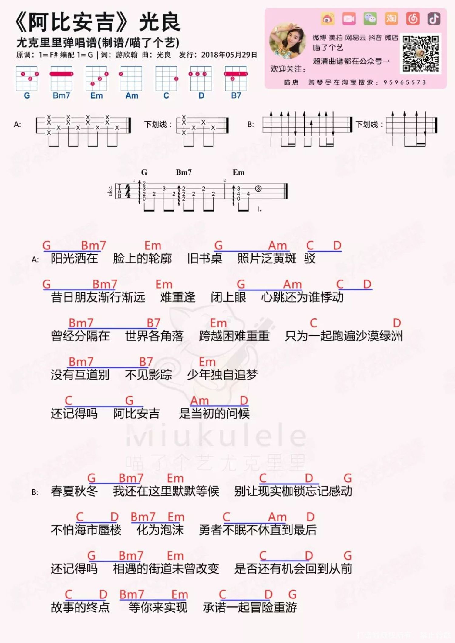 曲谱介绍: 有些友情特别简单,就是一起上课放学,一起游戏打闹,但一不小心走过了几十年。MV里的【阿比安吉】意思是【再会】,我在故事的终点等你一起来实现。   喵了个艺翻唱   尤克里里谱
